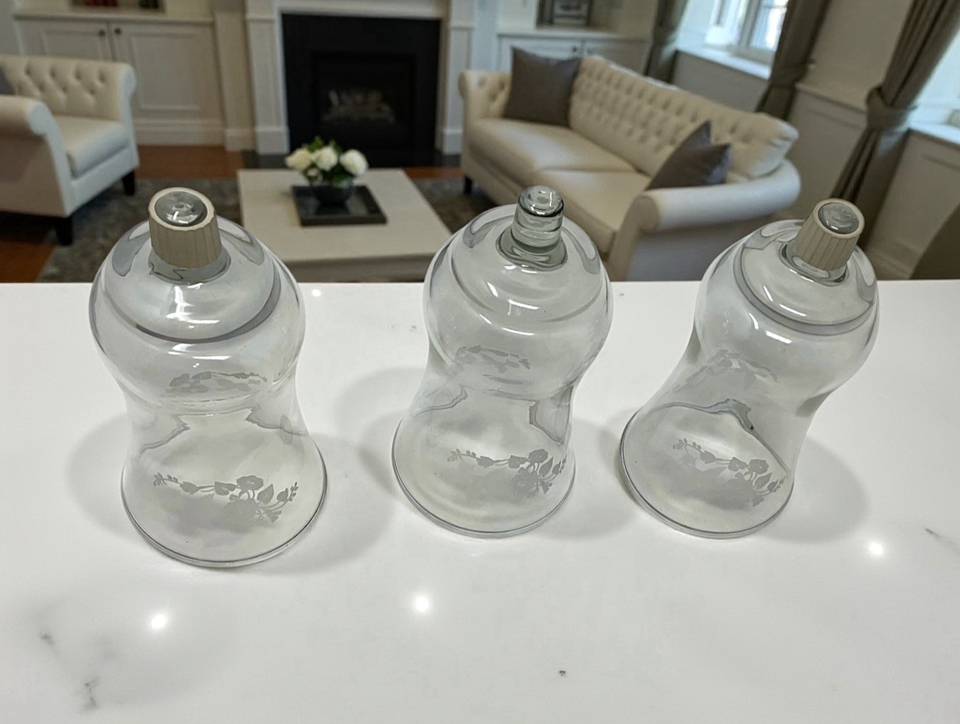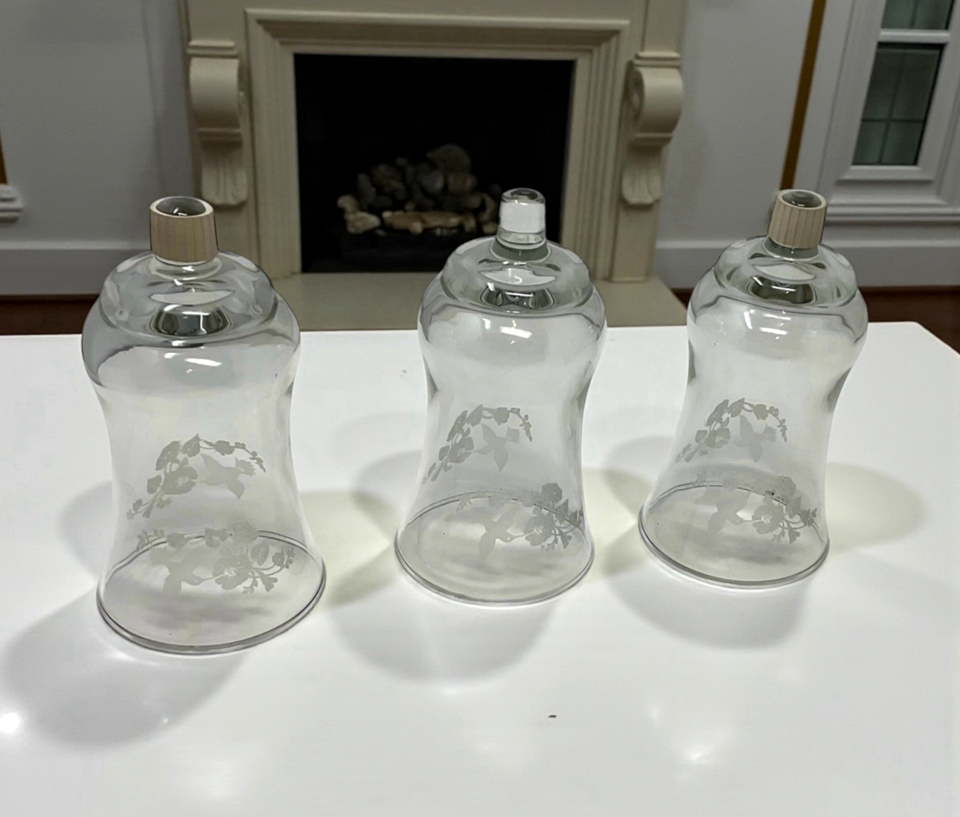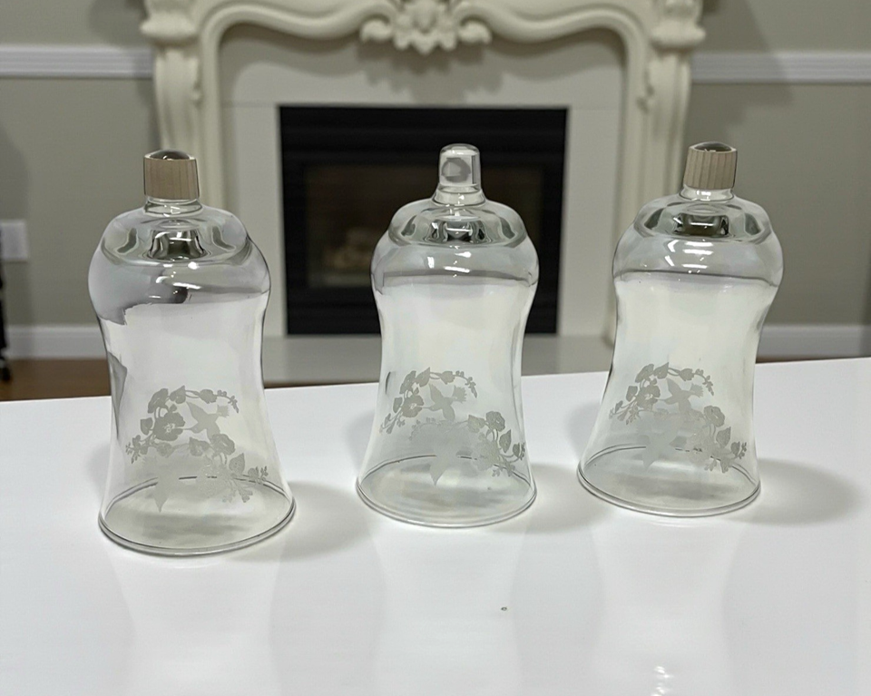 3 HOMCO Etched Glass Hummingbird Votive Holders Vintage Floral Peg Set 5.75"