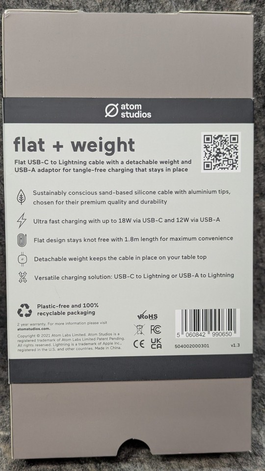 Atom Studios USB-C/A to 8 Pin 1.8m Cable Weighted