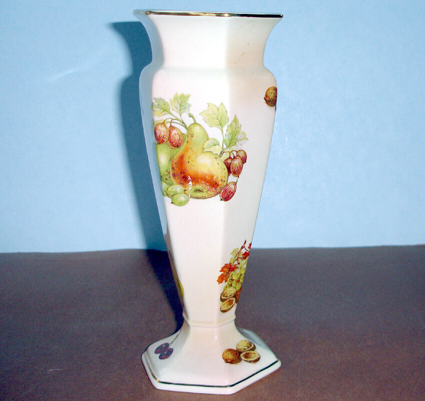 Royal Worcester Palissy Fruit 9" Vase Footed Hexagon Shaped Royale Collection
