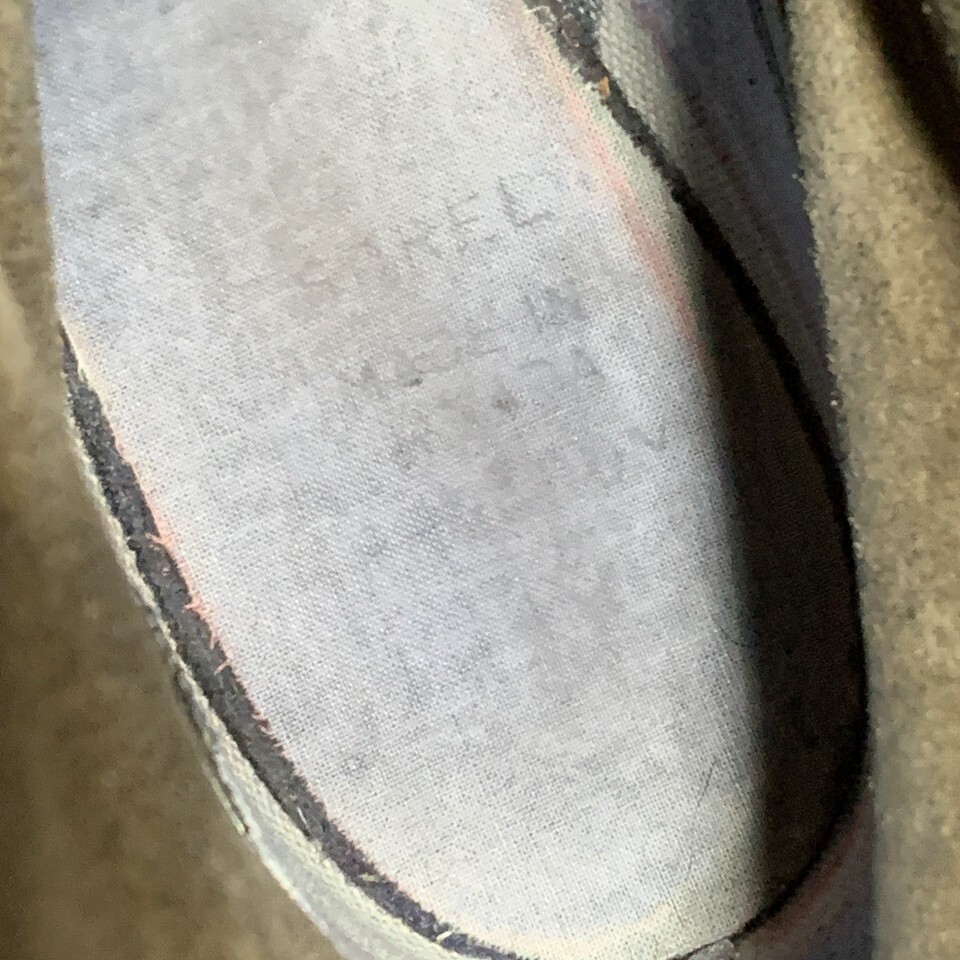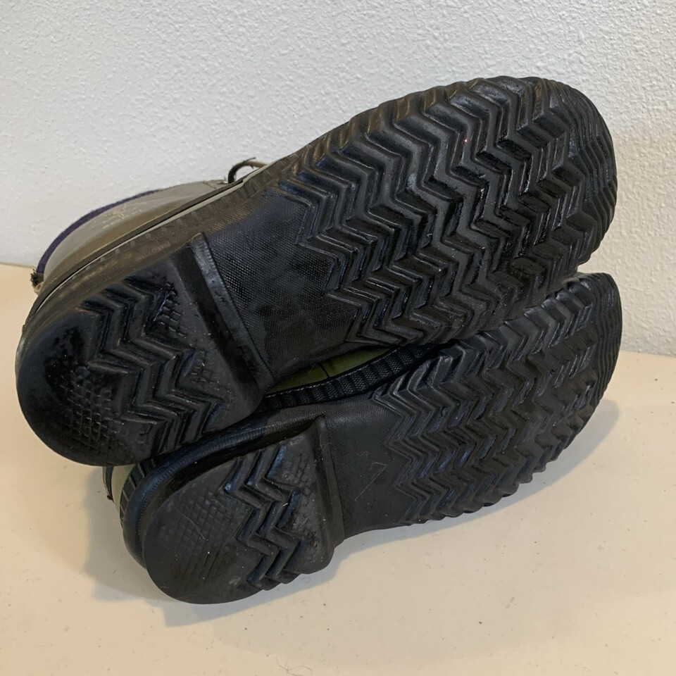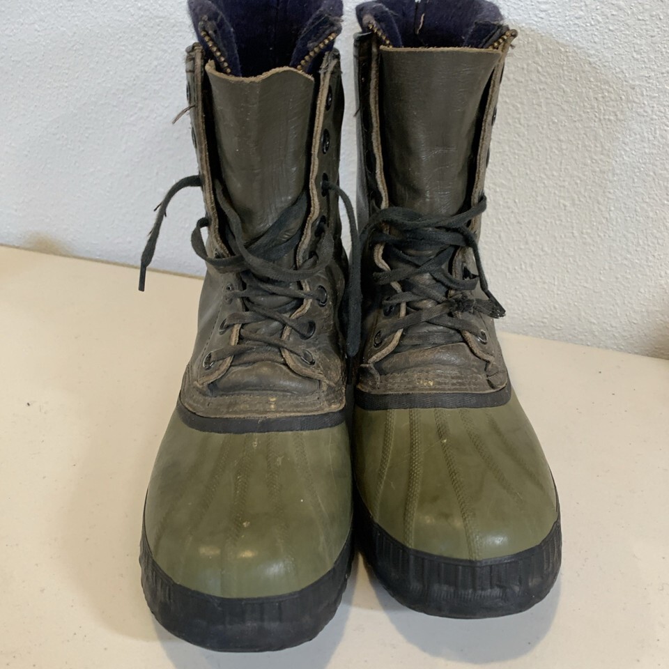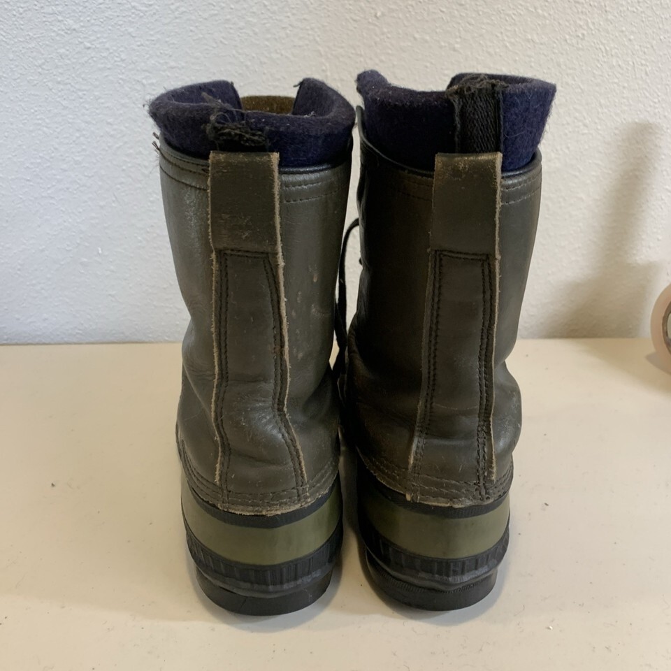 The product is a vintage pair of Sorel Kaufman 10? boots in size 11, made in Canada. These mid-calf style boots feature a solid green color with a round toe and lace-up closure. The upper material is leather, and the lining and insole are both wool, making them perfect for winter and fall seasons. The outsole is rubber, providing waterproof performance and durability. These snow boots from Sorel are a reliable and stylish option for any outdoor adventure in colder weather.