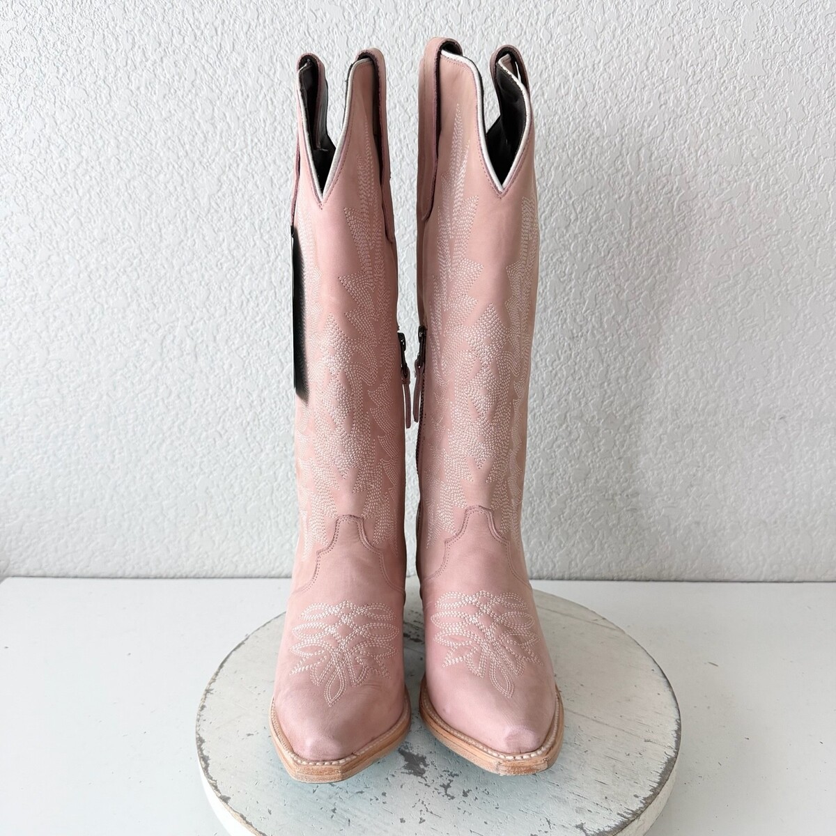 Lane GALLATIN Womens Cowboy Boots in Blush Pink Leather with a tall 16" Mid Calf shaft and Western Pointed Snip Toe