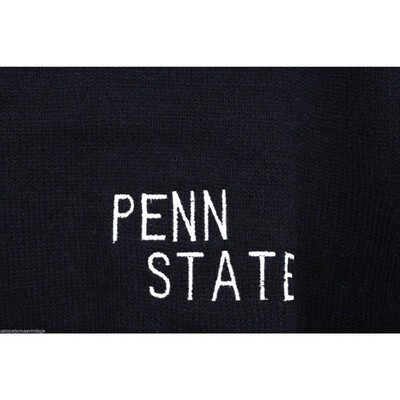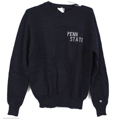 True vintage Champion Penn State University sweater in navy blue acrylic/nylon blend. Features a 3? ribbed knit waistband and cuffs. Made in Taiwan, possibly late 1970s?early 1980s based on construction and label style. Recently discovered in a hoard of 1960s?80s apparel.