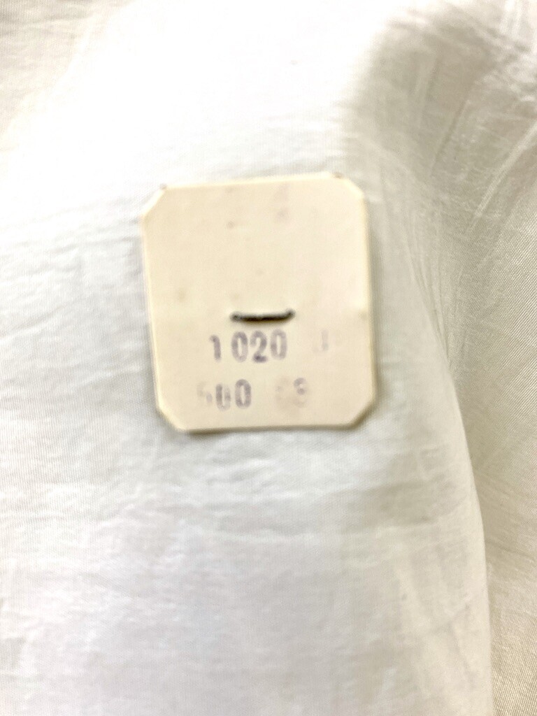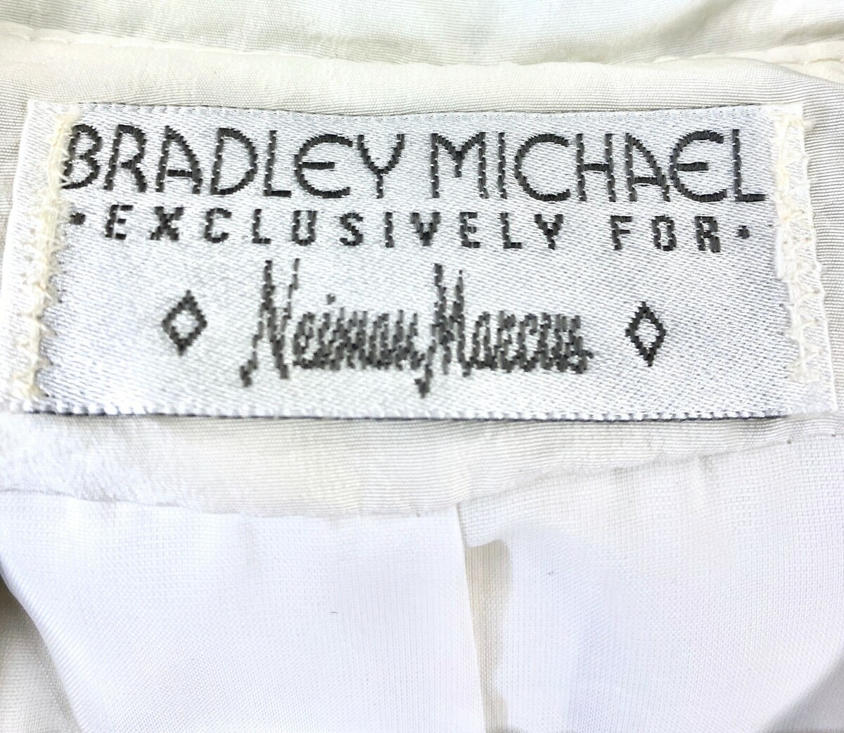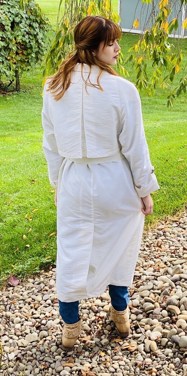 Double breasted vintage white textured nylon blend trench coat by Bradley Michael, with silver buttons that remind me of Paloma Picasso logo. Lined in polyester and has two slash pockets and self belt. It is a warm white not a cool or icy white- hope that helps! Marked size 8 but a bit roomy with raglan sleeves. Big shoulder pads..