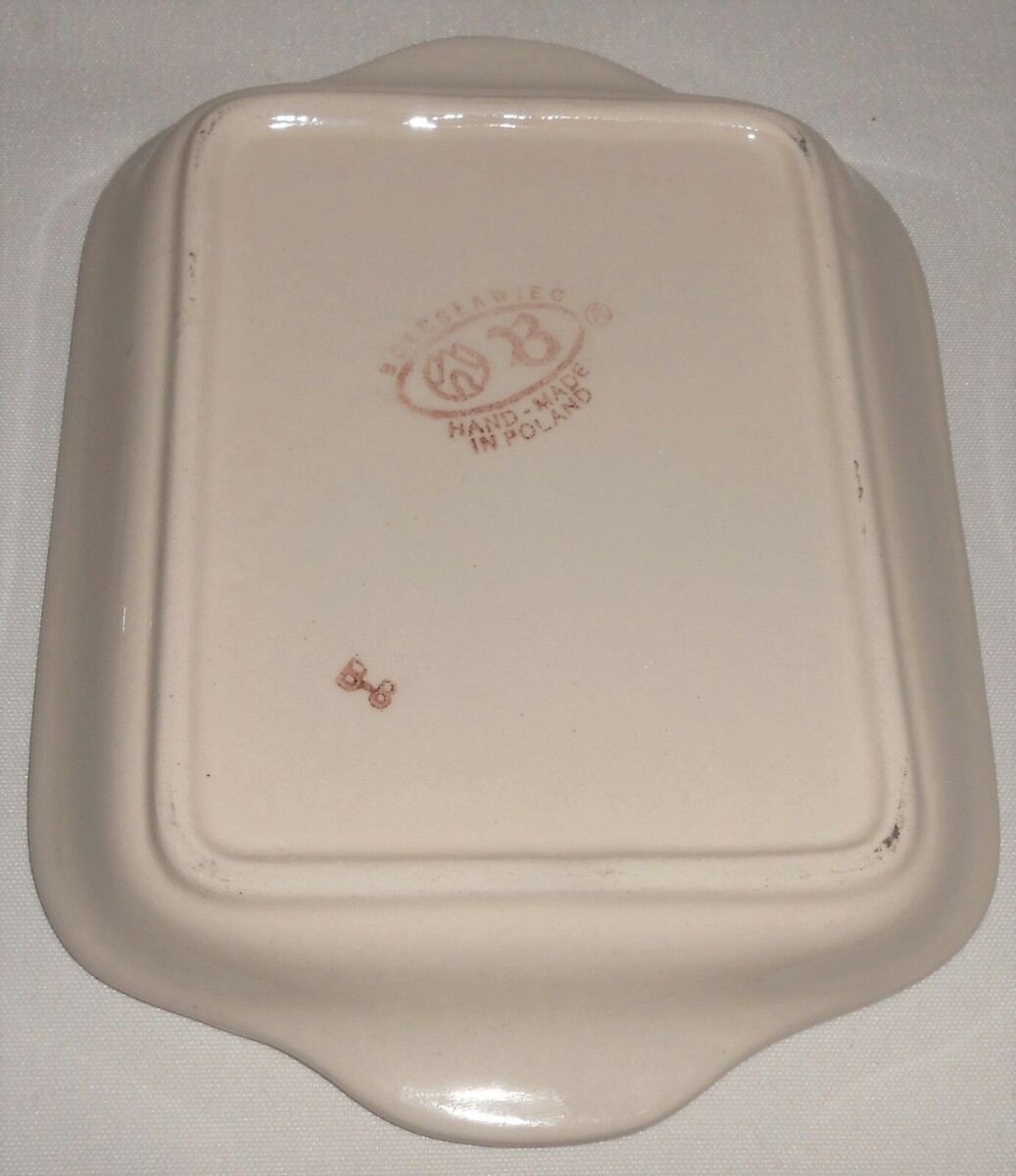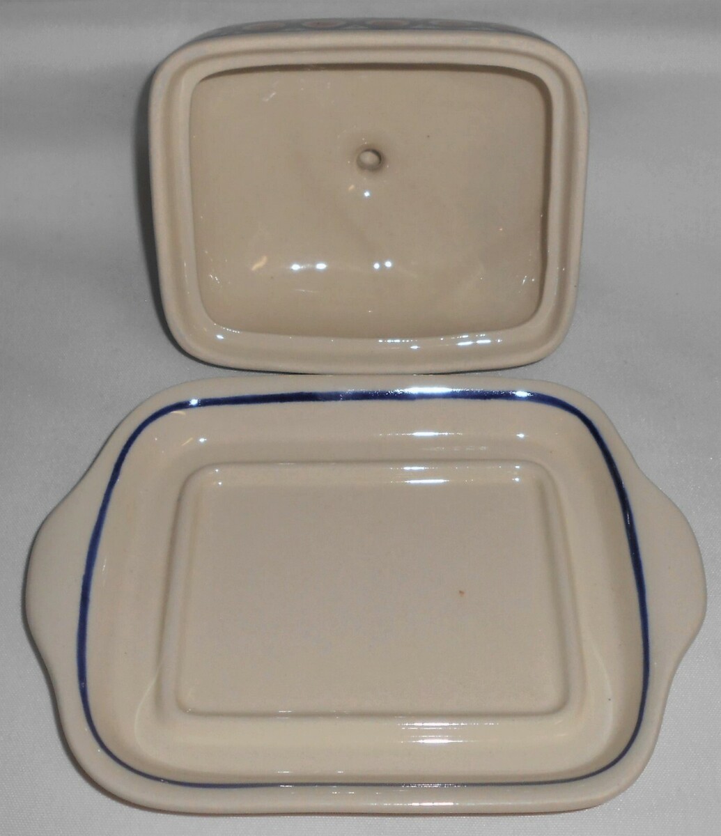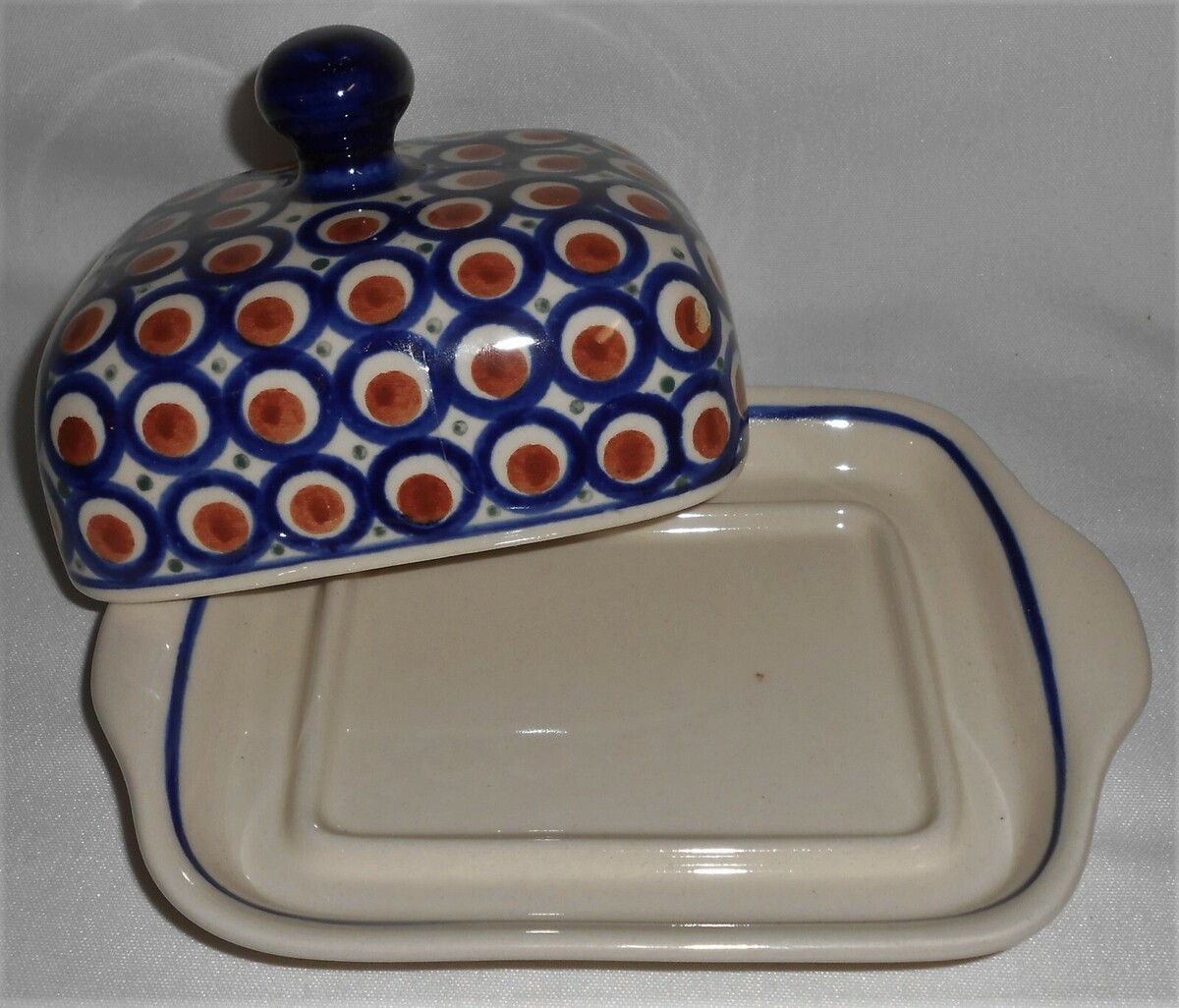 This is a nice quality Hand Made Polish Pottery Blue with Brown Dots in Blue and White Circles Covered Cheese or Butter Dish that measures approx 7 3/4" x 6" at base and approx 2" tall inside and marked Boleslawiec as shown in photos above. It is in good pre-owned condition with no chips or cracks.