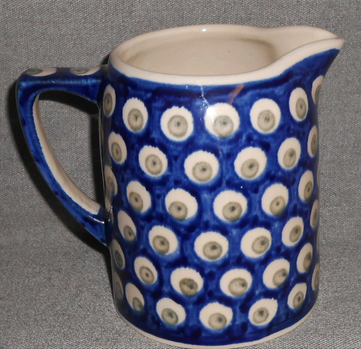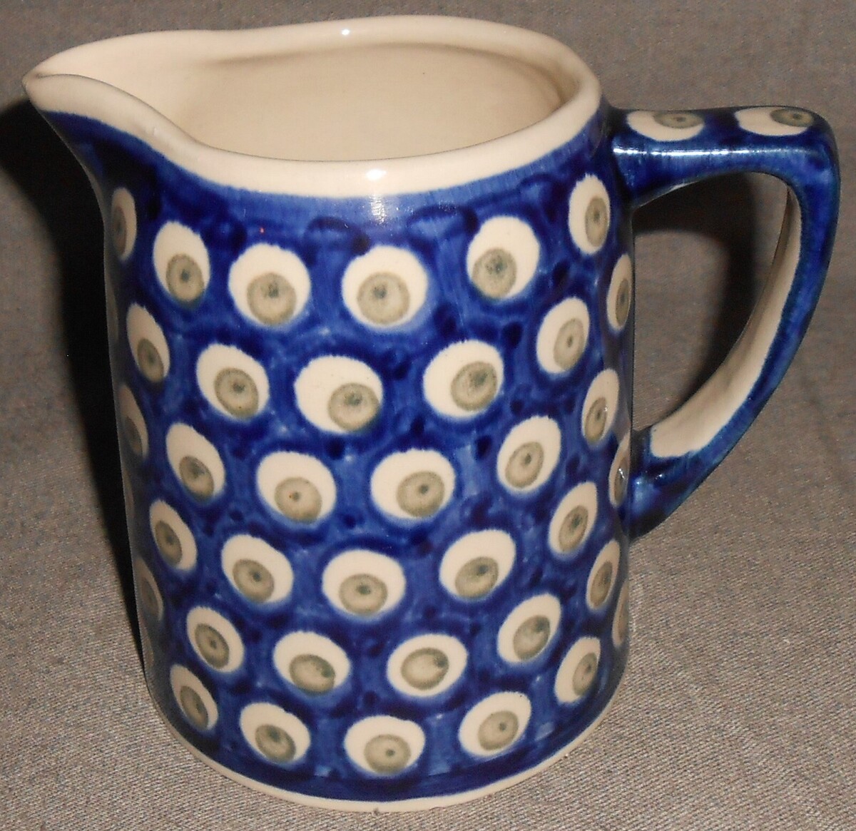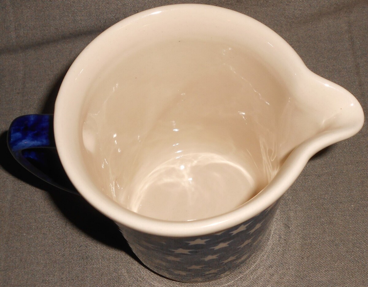 This is a nice quality Hand Made Polish Pottery 20 oz Blue with Green Dots inn White Circles Pitcher that measures approx 5" tall and marked Boleslawiec as shown in photos above. It is in good pre-owned condition with no chips or cracks.