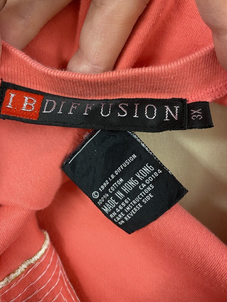 Label History: I.B. Diffusion was a U.S. brand known for bold, playful printed and embellished T-shirts during the 1980s?90s. Their designs often incorporated novelty graphics and bedazzled accents, making them popular among golf, resort, and leisurewear markets.