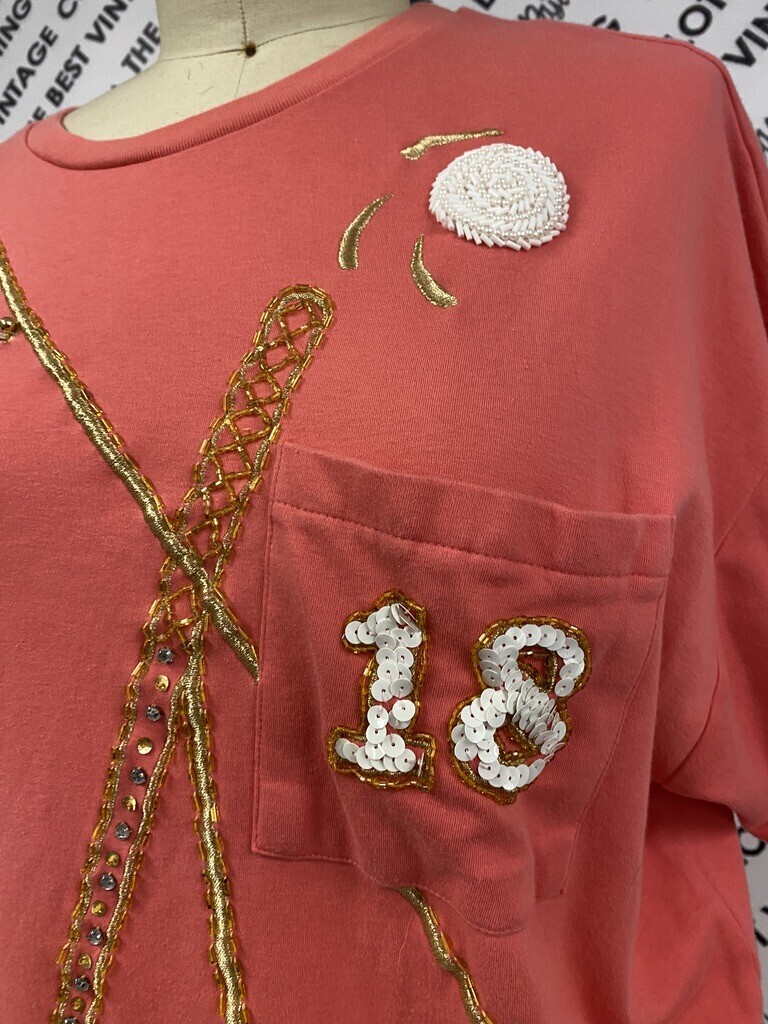 Rare 1992 I.B. Diffusion oversized golf T-shirt in salmon pink cotton. Features ?18? and golf clubs with playful bedazzled detailing across the chest. Designed to be way oversized with a roomy drape.