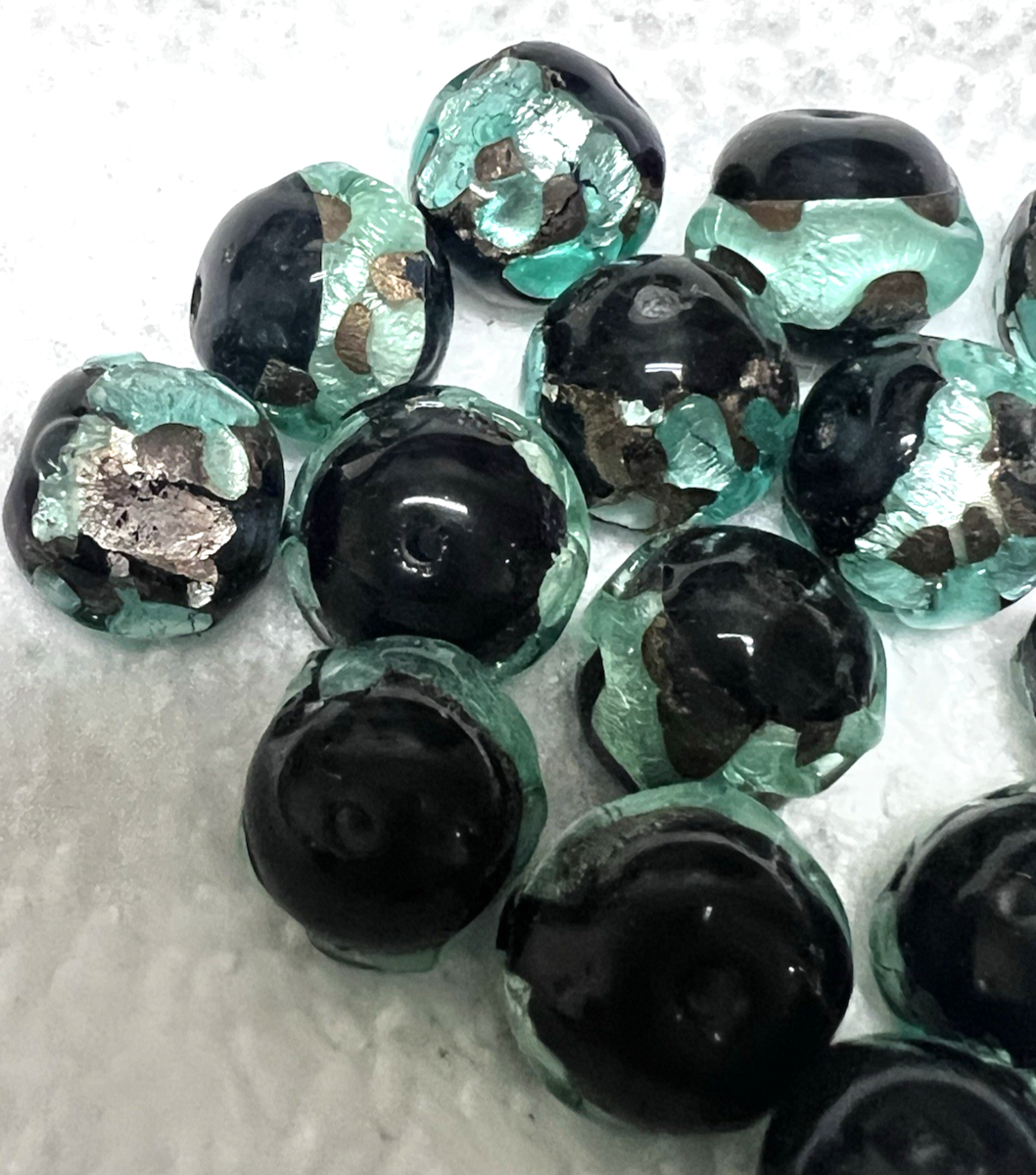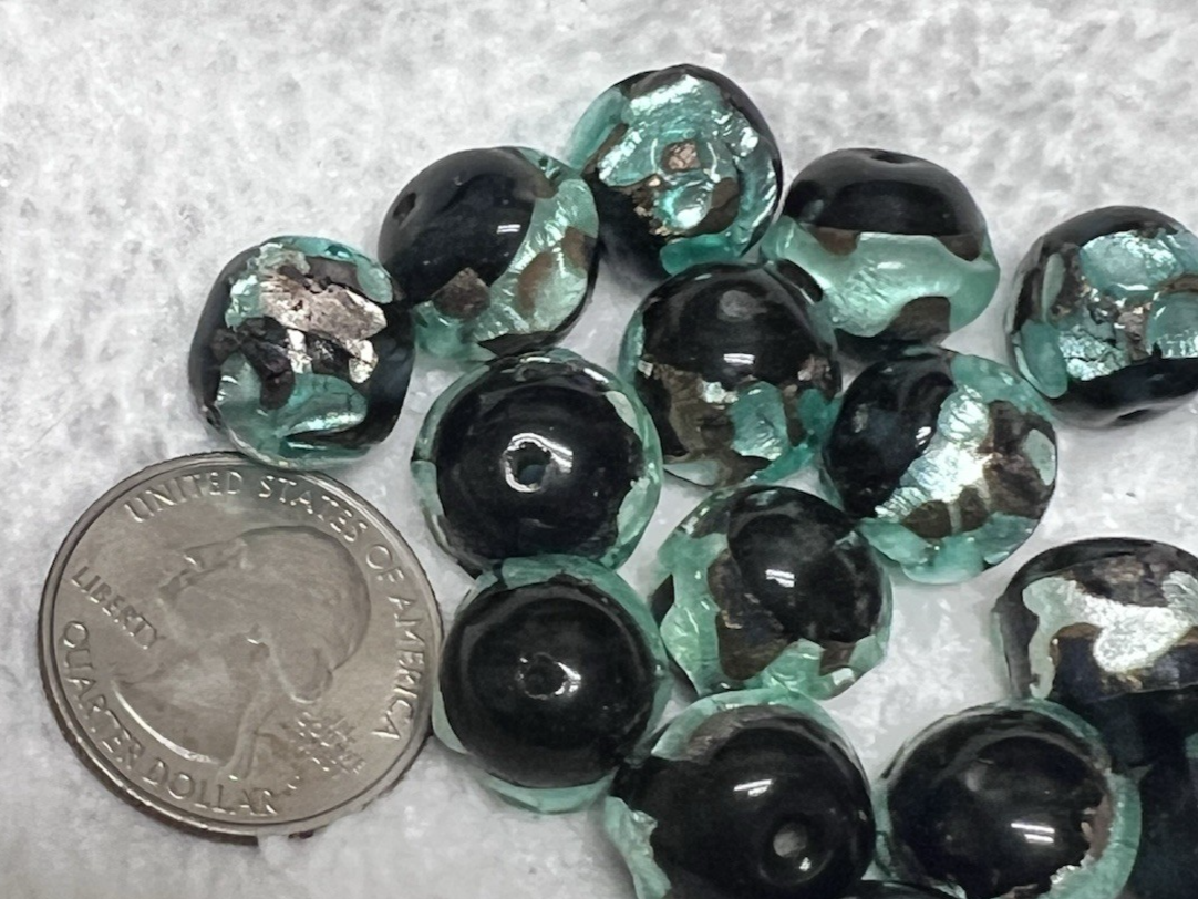 17 Vintage Art Glass Beads Teal Foil w Glossy Black Rounds 1/2" no 2 are the same and a couple much less shimmer than others each is different