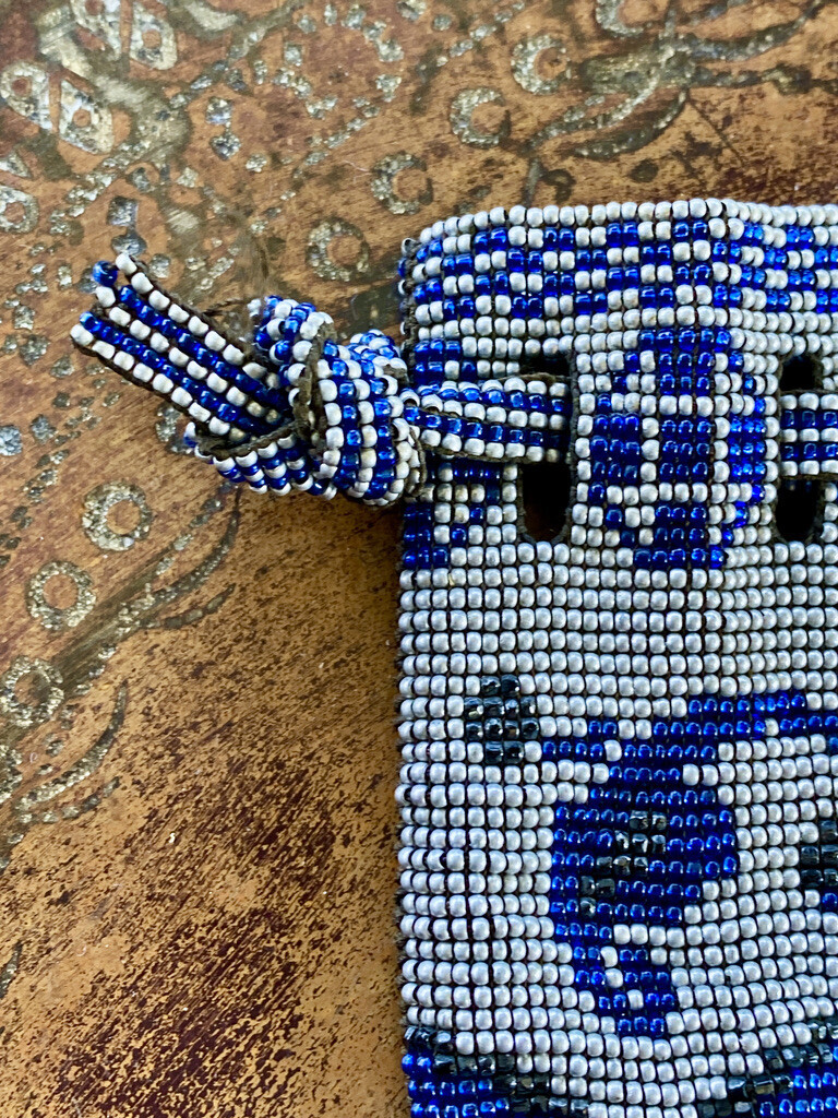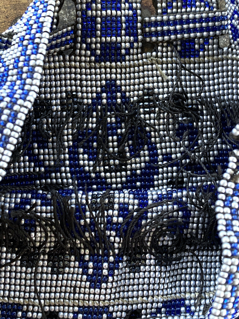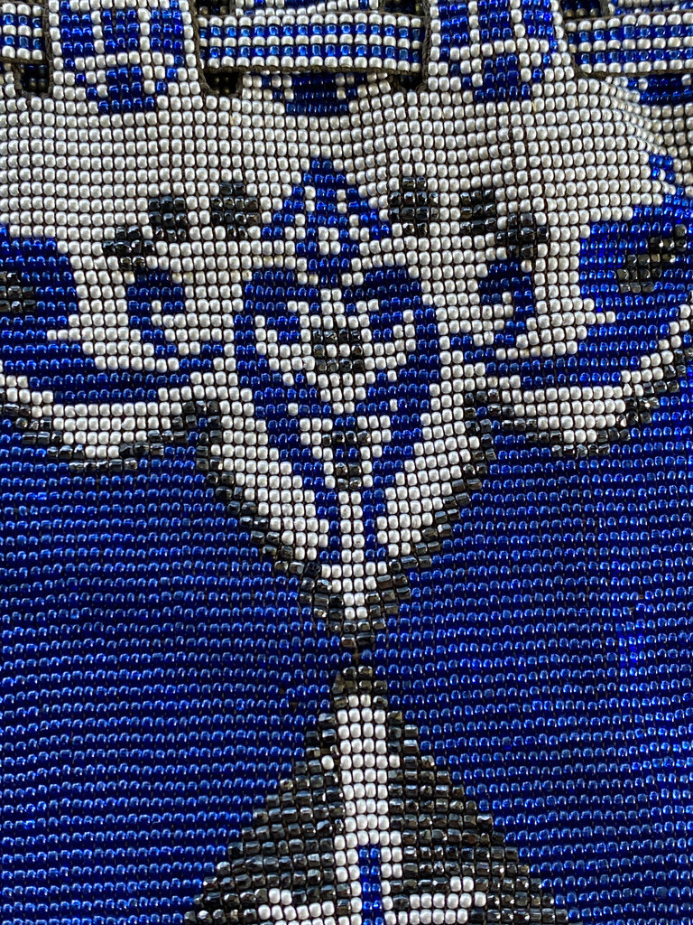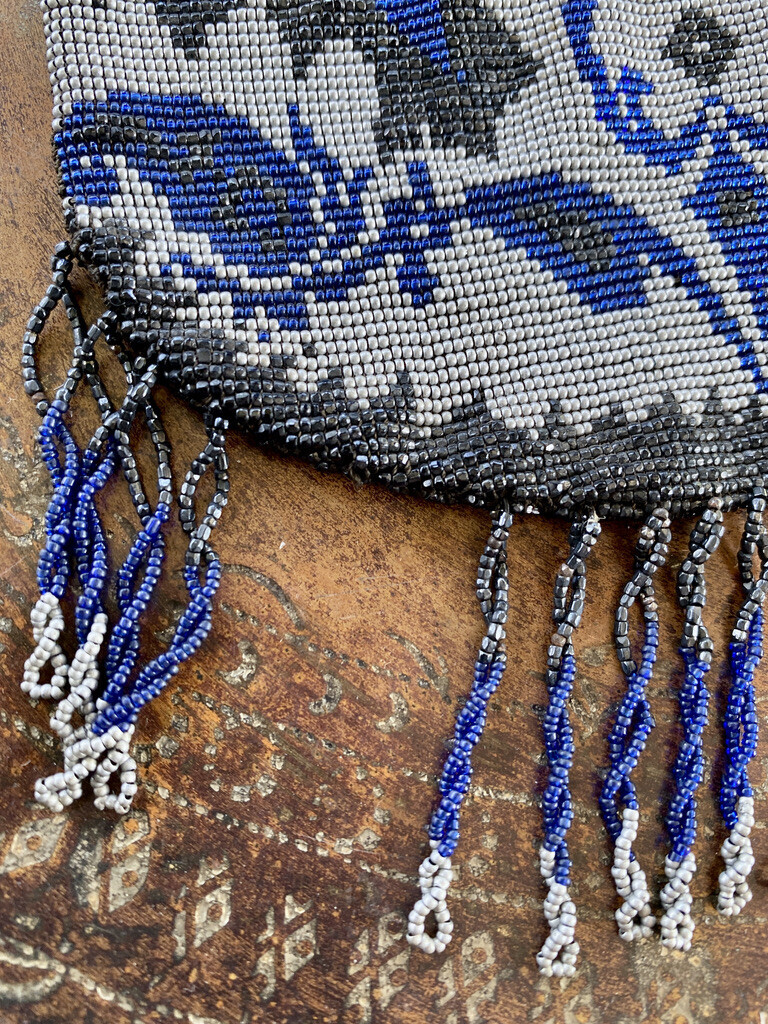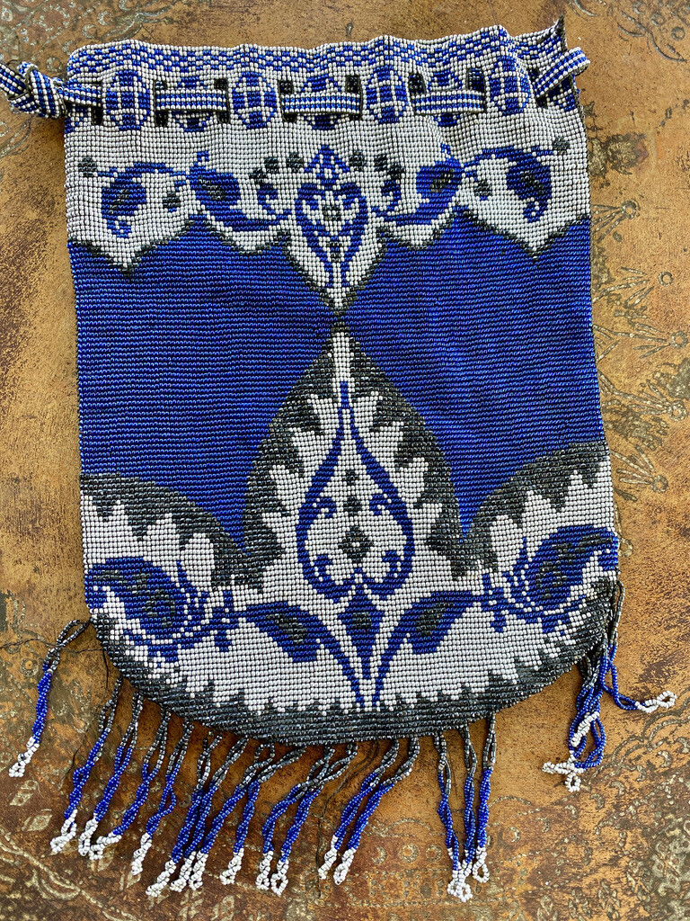 The antique Art Deco 1920s micro beaded bag and it's drawstrings are in perfect condition, no beads missing. Some fringe is missing, and there is no lining. It's quite heavy and drippy. The cobalt blue really shows with light behind it.( see last photo)