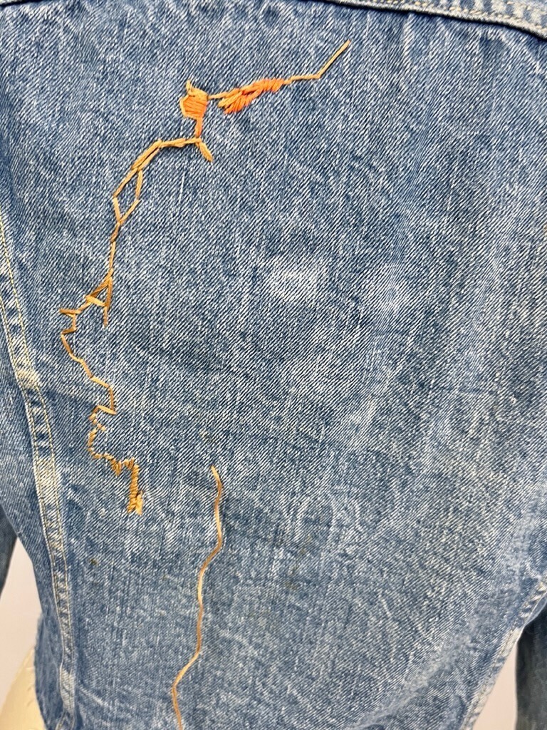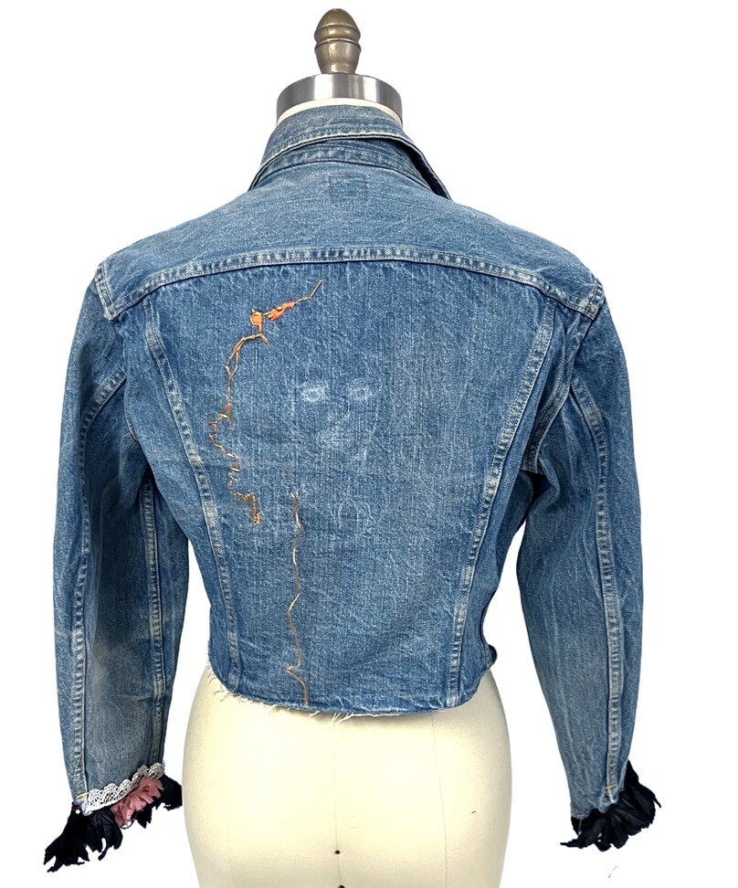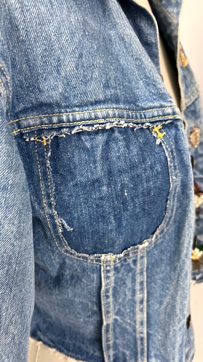 Lee Riders Denim Jacket Vintage Sanforized PATD-153438 Union Made USA 70s S- it has been re-fashioned! The chest is 38". More for a girl now, with jeweled embellishments and embroidery.