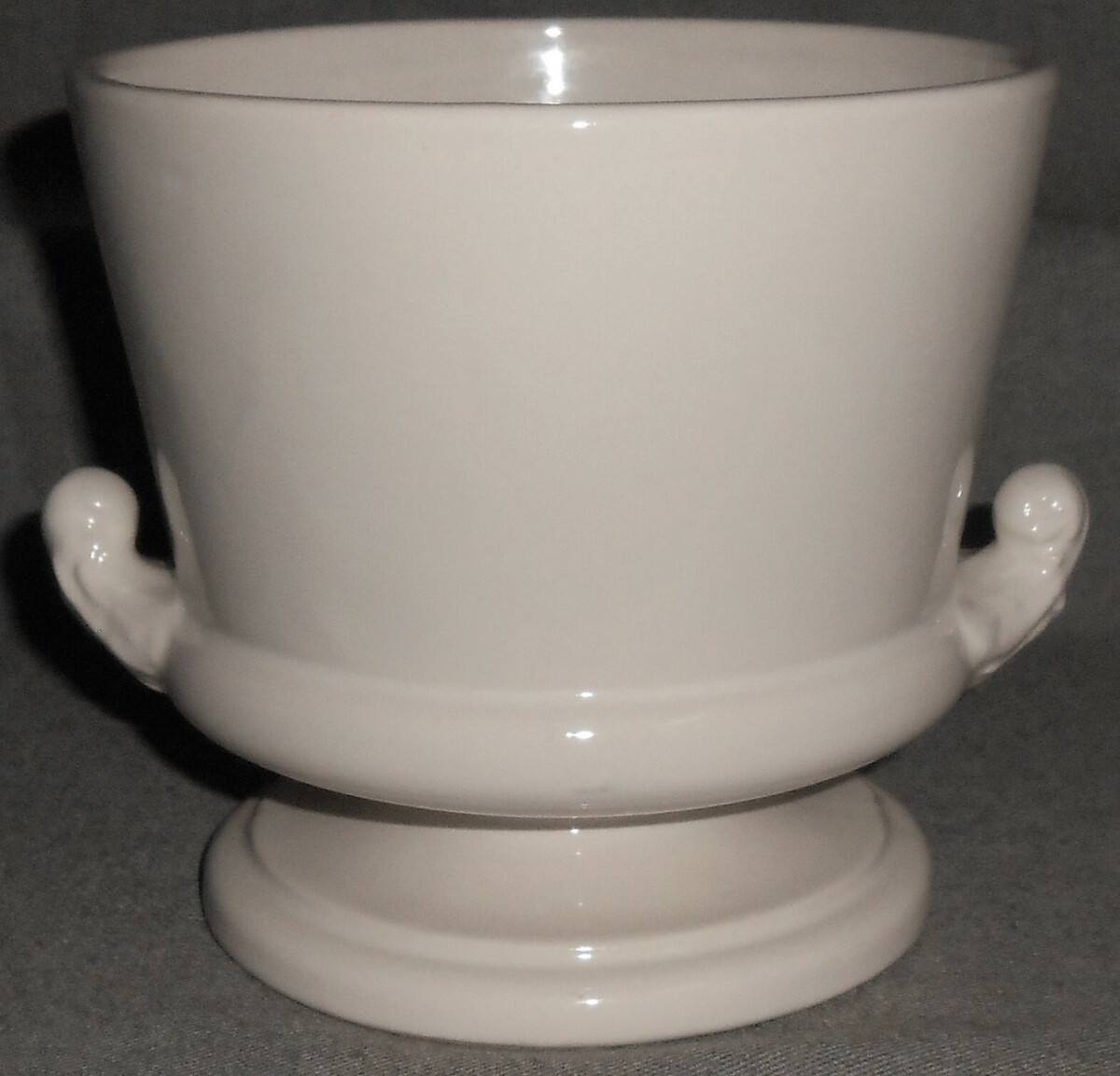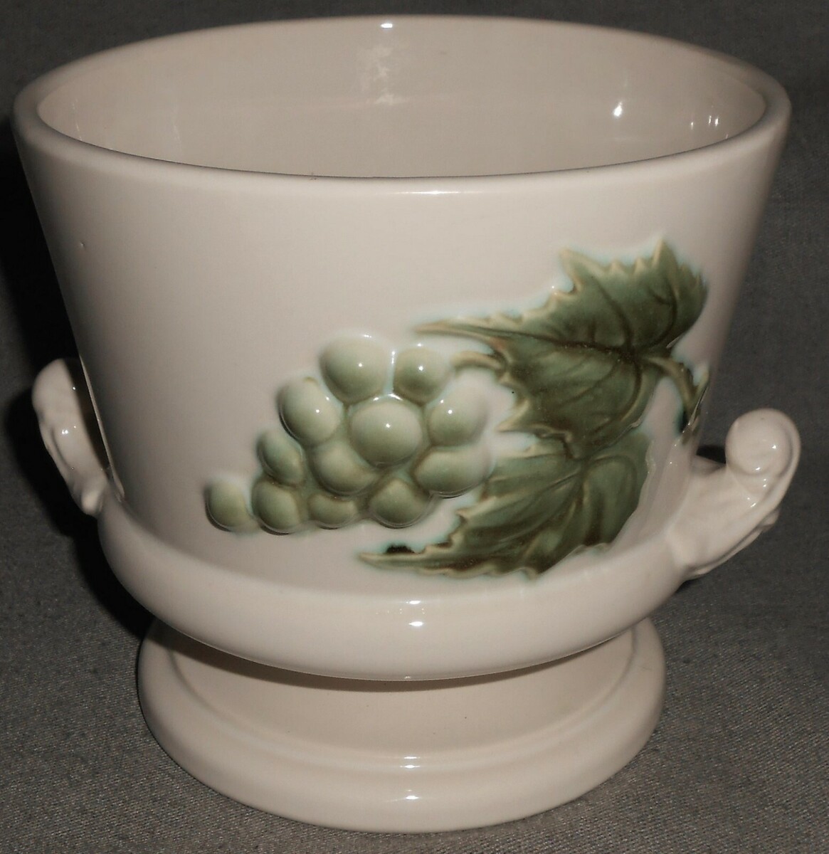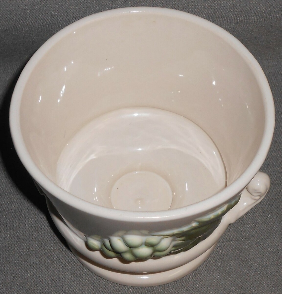 This is one of the Eames influenced 1950s Hull Pottery designs that is a Basket with a Grapevine Handle and Grapes Motif and has the White and reen color combination and it has the incised mark in script on the bottom though it is hard to read - looks like a #5 and "Tokay" and "USA". I think the pattern is called Tuscany but I also see it referred to as Tokay. It measures approx. 5 1/2" tall x 6" across at mouth and it is in good pre-owned condition with no chips or cracks.
