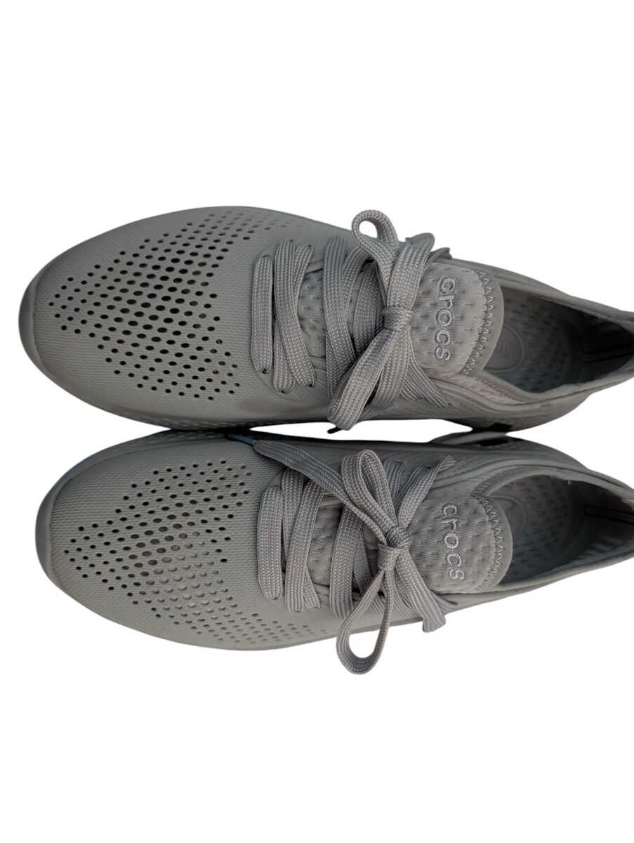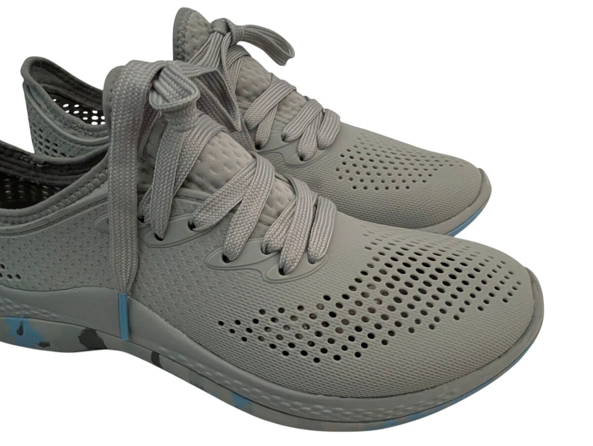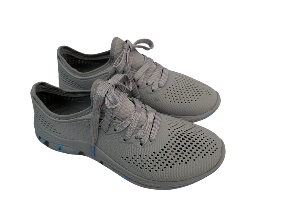 These are women's Crocs Lite ride Pacer shoes. These are perfect as water shoes. Women's size 9. Gray with gray charcoal and light blue camo soles. I honestly don't even know if these shoes have ever been worn. They are in MINT condition!