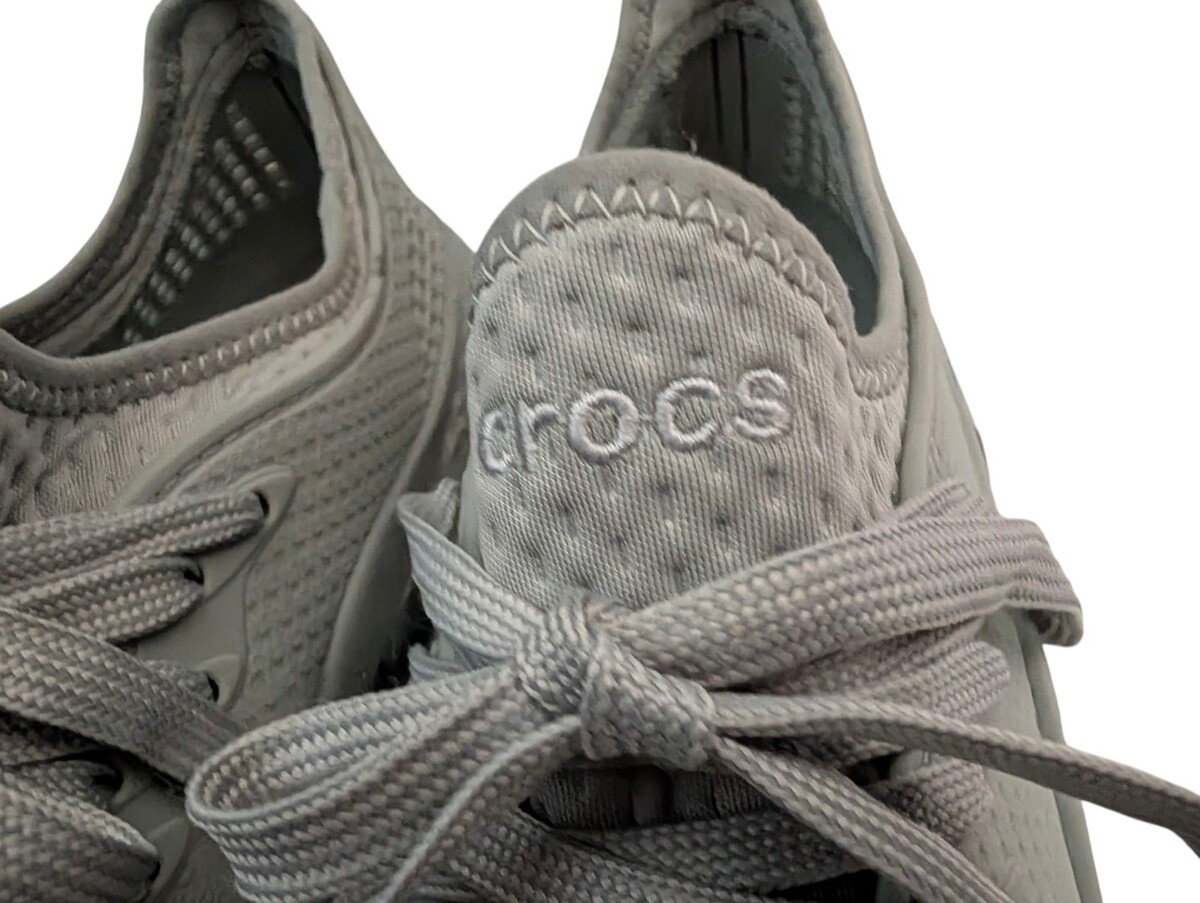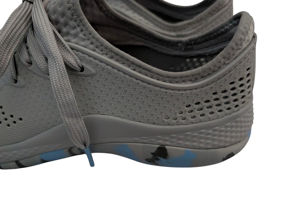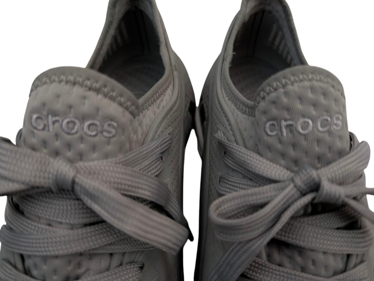 These are women's Crocs Lite ride Pacer shoes. These are perfect as water shoes. Women's size 9. Gray with gray charcoal and light blue camo soles. I honestly don't even know if these shoes have ever been worn. They are in MINT condition!