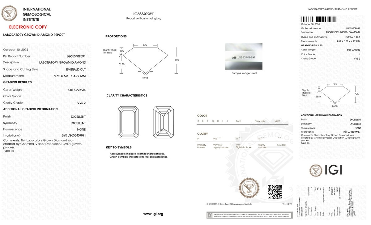 Terms Conditions:Kindly keep this in mind before making your purchase that we are selling our Lab grown diamonds on multiple platforms. The Diamond you receive will be exact color, clarity and cut. The only difference could be the IGI certificate which might differ from the listed stone. We highly appreciate your cooperation.Stock#731365AShapeEMERALDCts1.02ColorHClarityVVS2LabIGICut-PolEXSymVGFlour-Depth%66.9Table%61Length6.7Width4.9Depth3.28Ratio1.37CuletLONGC/A-C/H14.5P/A-P/H46.5 - 43.4BrandCVDAGCountry Of Origin-HCAPlease note that we are listing all of our stone's color clarity grade as per IGI Lab Report. IGI Lab is the 2nd most reputable trustworthy Lab after GIA. Every person can have a different opinion about the color clarity of the stone. So the stones you are getting can be one or two grades lower in color clarity grade as per GIA standards but as IGI standards those are as mentioned in the listing. I am not sure how practical it is to use $75000 (3 Carat E VS!) Natural Diamond stone standard for the same color clarity grade (3 Carat EVS1) Lab Grown Stone which you are getting for $750. My advice to you is whatever authenticity says please please get the stone if you do not like then I will accept the return without any question in the next 30 days of purchase. I don't want you to miss the great opportunity to buy those beautiful lab grown stones which are 100% the same chemical other properties wise as natural Diamonds at 1% of price compared to Natural Diamond.