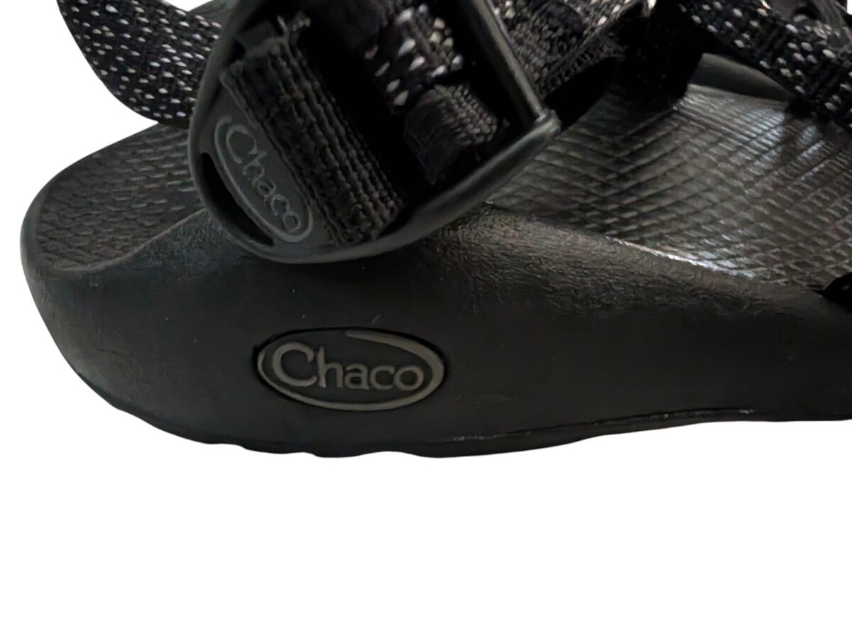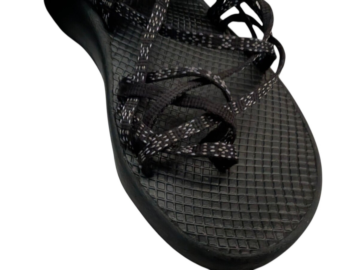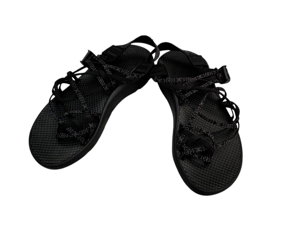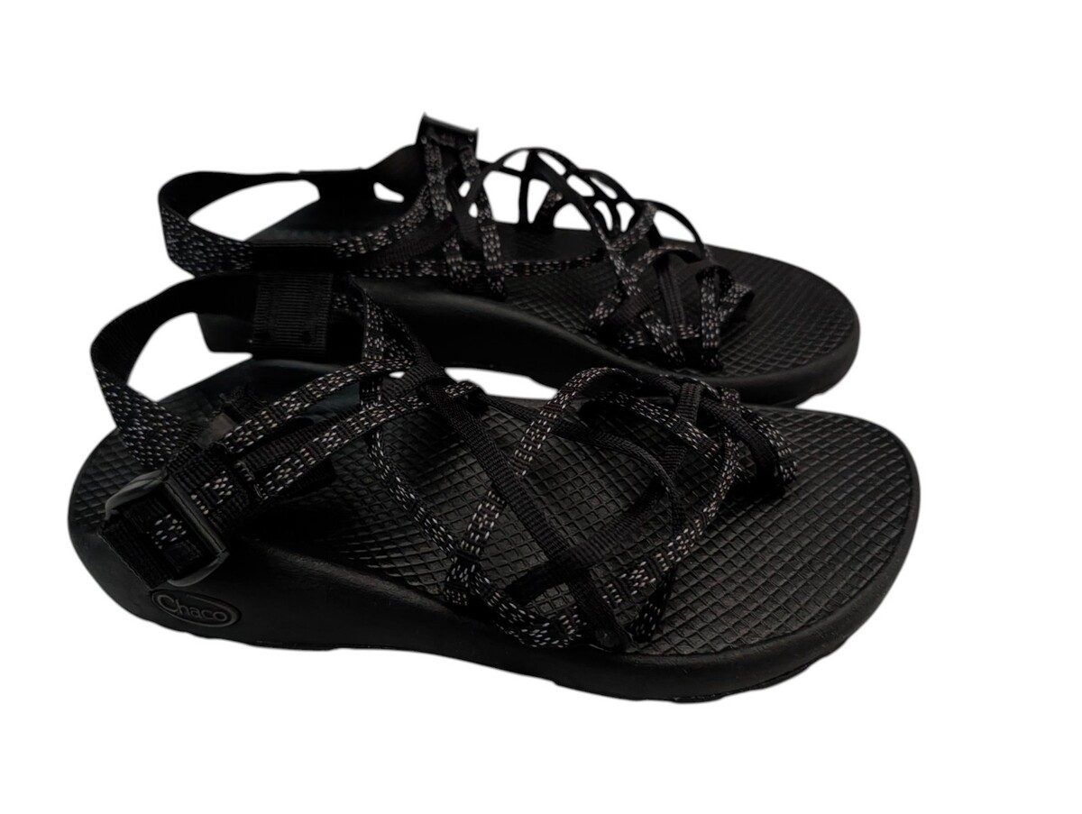 women's Chaco ZX2 black criss cross sandals in size 8. These sandals feature a strappy style with a synthetic upper material, making them durable and comfortable for everyday wear.