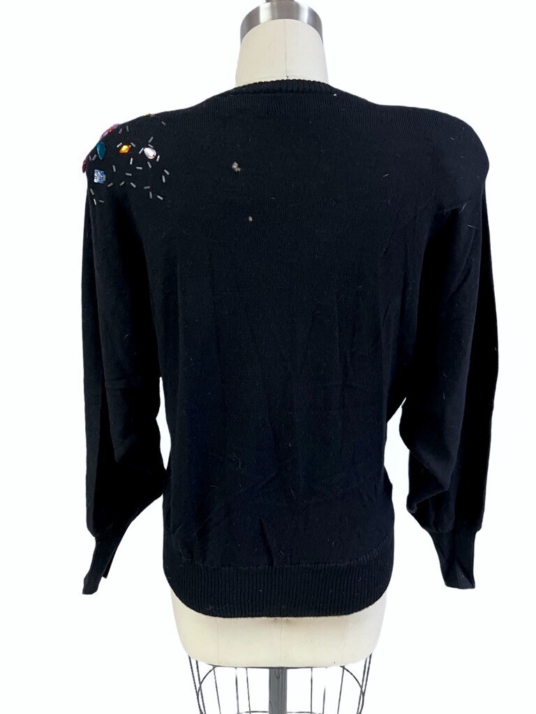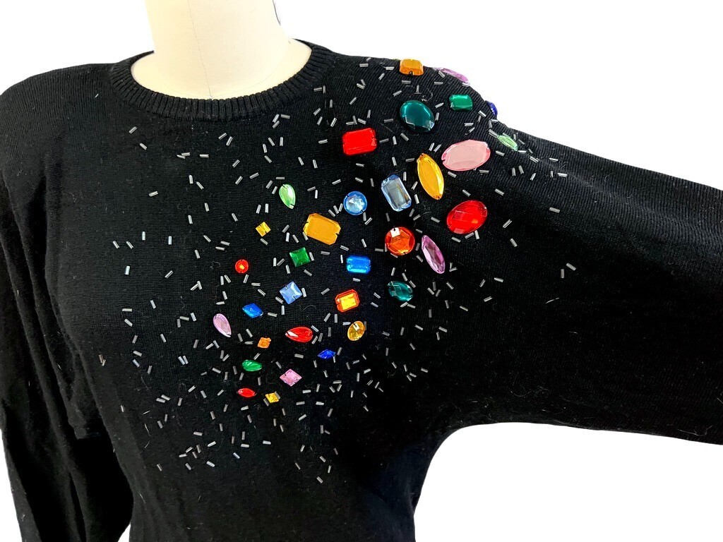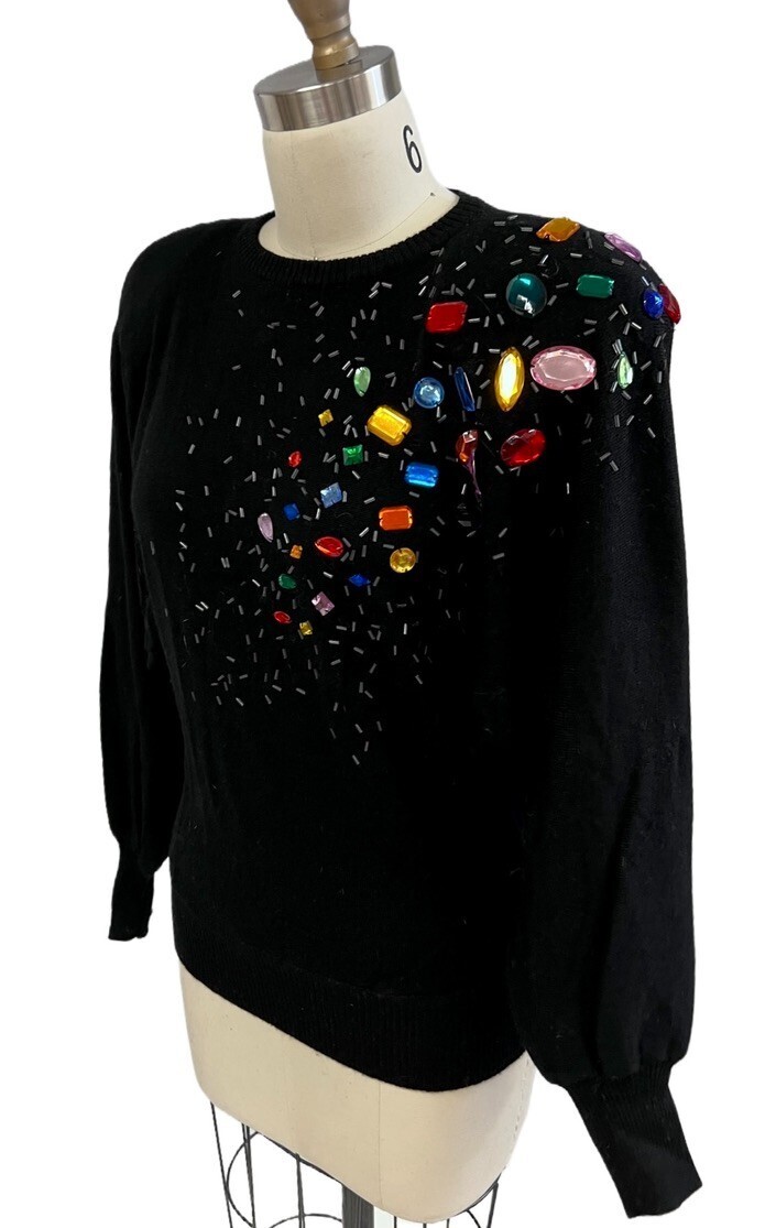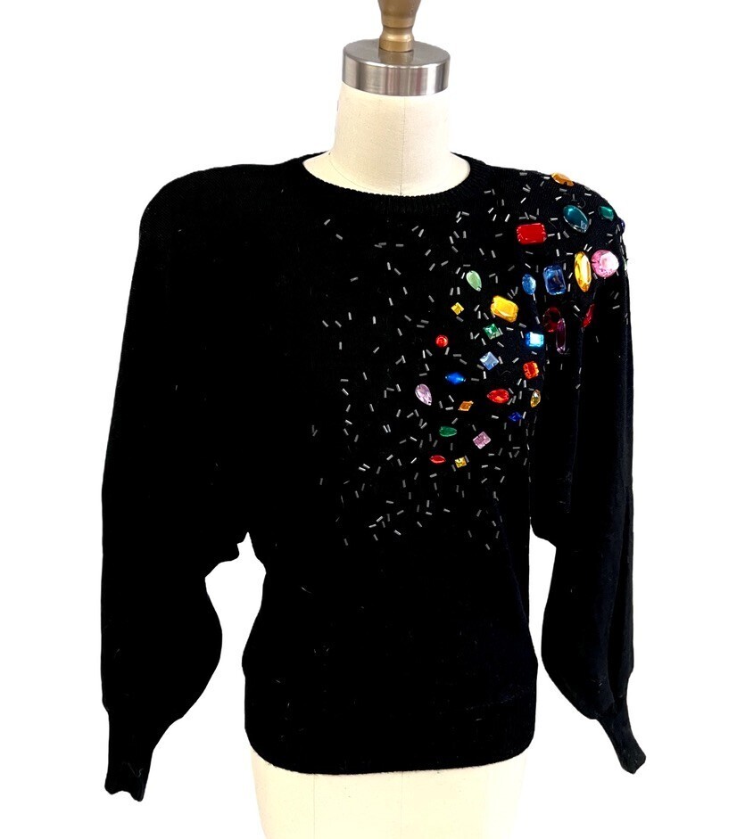 Ann Tjian for Kenar rare vintage 1980 jeweled oversized lambswool sweater size S- raglan sleeved sweater, with loads of large jewels smattered on the front with some tiny bugle beads. Big padded shoulders.