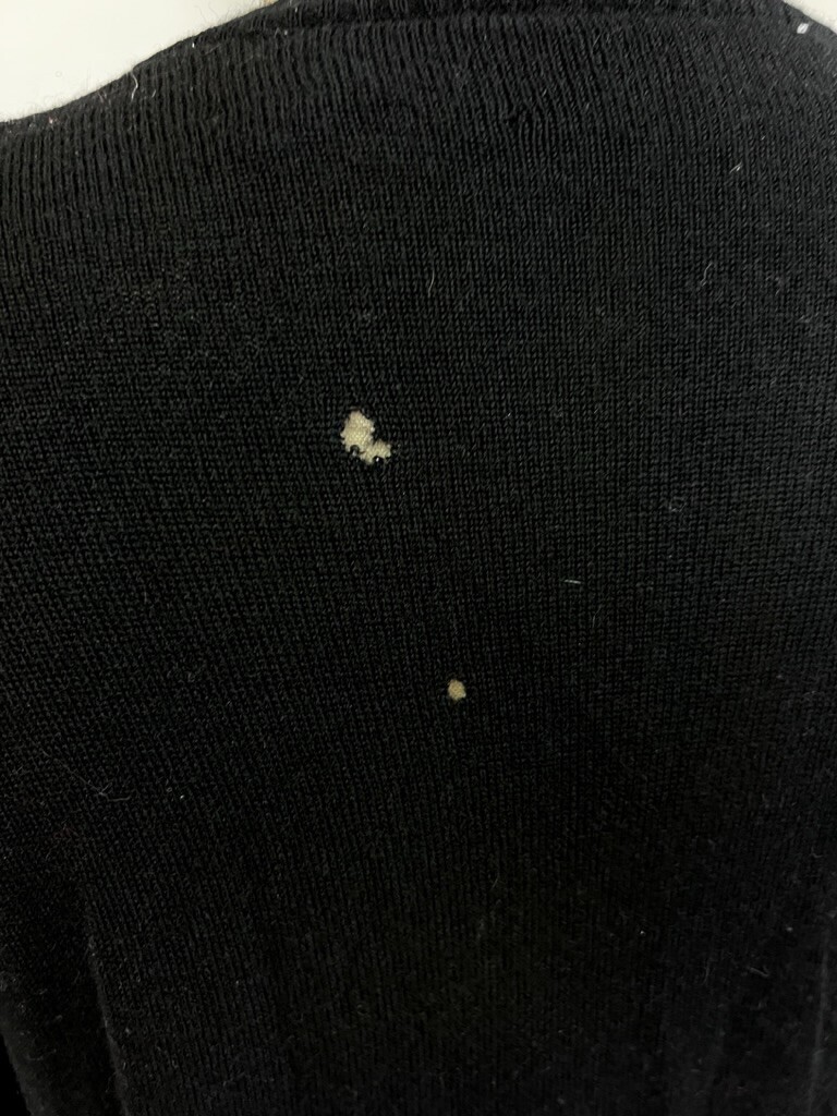 Flaws: It has 2 small holes in the back, as shown and 2 on the front of the left sleeve-Otherwise excellent.