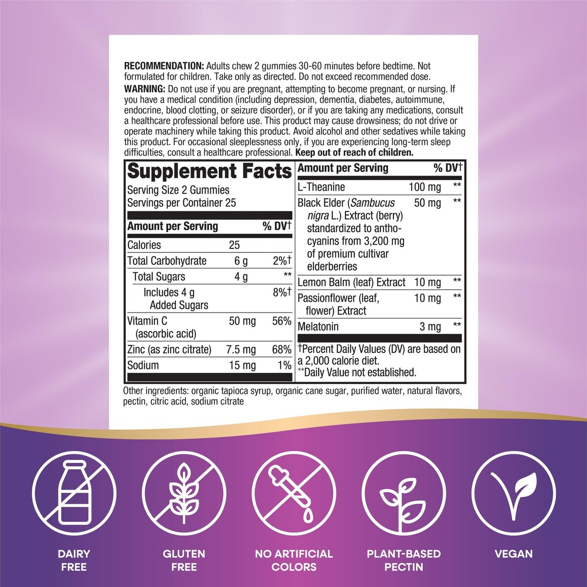 3 Bottles Expiration Date of 06/2026 ? Nature's Way Sambucus Sleep + Immune* Support Gummies are formulated with melatonin for occasional sleeplessness, and vitamin C and zinc for healthy immune function support.* ? Also formulated with elderberry extract, L-theanine, lemon balm extract, and passionflower extract. ? Adults chew 2 gummies 30-60 minutes before bed. ? Gluten-free and vegan. No wheat, soy, egg, peanut, dairy, gelatin, or artificial colors. Made with plant-based pectin. ? At Nature?s Way, we believe nature is the ultimate problem solver. For over 50 years, we have looked to the natural world for inspiration. Our quality vitamins and supplements are formulated to help you find your way to wellness.