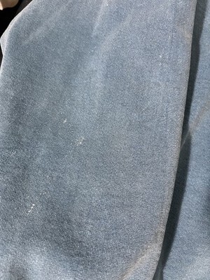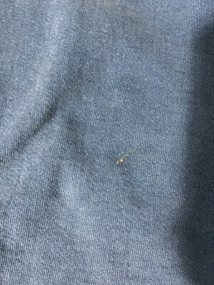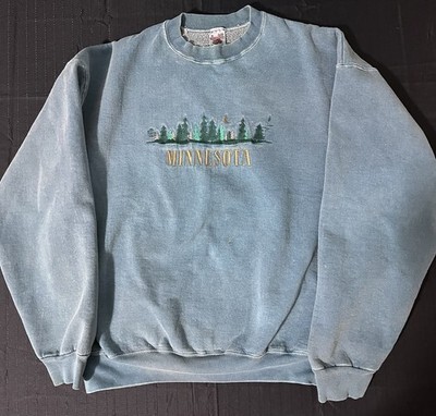 This Vintage Fruit of the Loom Supercotton Men's XL Blue Denim Crewneck Sweatshirt is a relaxed fit pullover made in the USA. It features a solid blue color with embroidered nature accents, long sleeves, and a crew neck neckline. Made of a blend of polyester and cotton, this fleece fabric sweatshirt is machine washable and suitable for all seasons, making it versatile for various activities like gym training, walking, cycling, golf, hunting, and more. Perfect for those who appreciate vintage style and quality craftsmanship, this sweatshirt is a timeless addition to any wardrobe. Shows great fade and a few small bleach spots(see photos) also has several paint spots throughout. Great look for a relaxed vintage style.