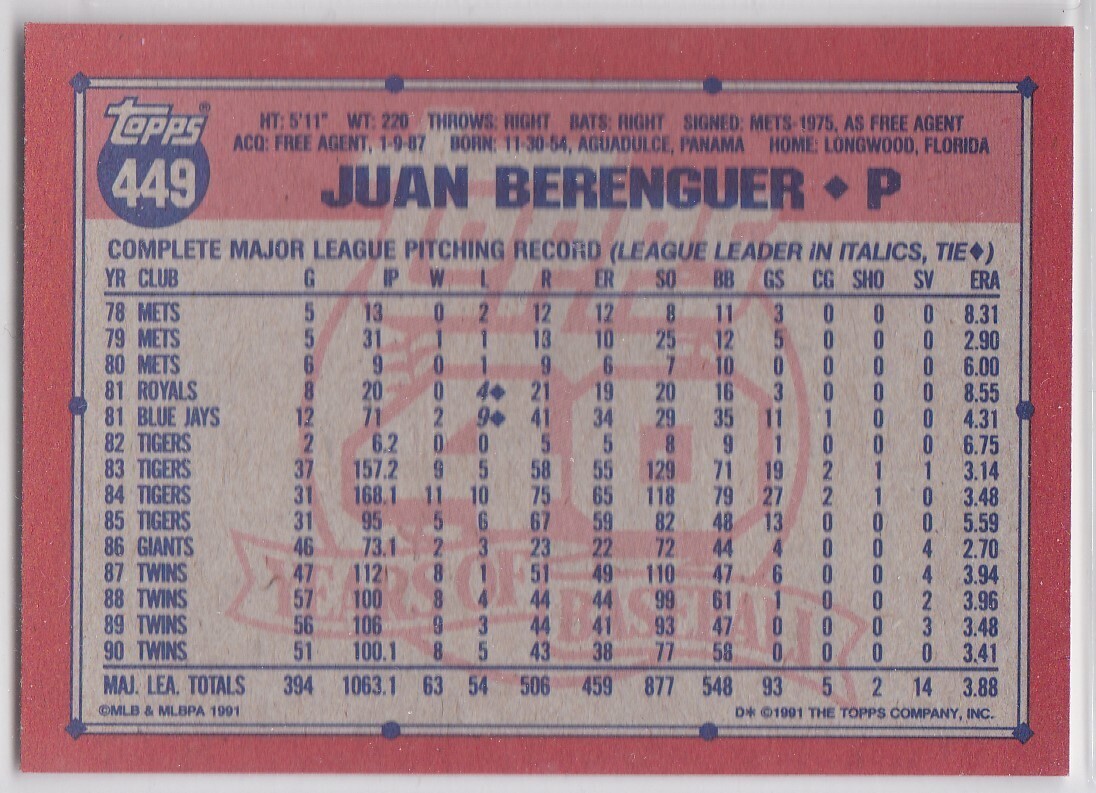 M) 1991 Topps Baseball Trading Card - Juan Berenguer #449