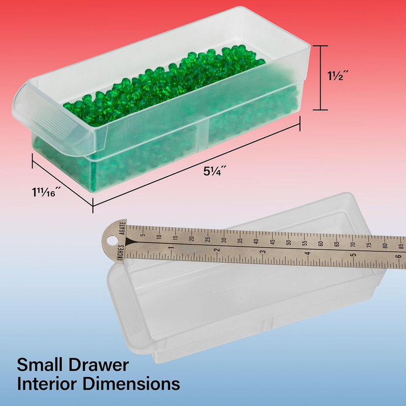 The Akro-Mils 10116 16-Drawer Plastic Storage Cabinet Organizer with Drawers is a great solution for all your storage needs. This heavy-duty cabinet is made in the U.S.A. from rugged, high-impact polystyrene plastic and features 26 large and small plastic drawers offering ample storage space for all your small parts and tools. Plastic organizer drawers inside dimensions: 5-1/4-Inch x 1-11/16-Inch x 1-1/2-Inch. Whether you're looking to organize your garage, workshop, classroom, or home, this storage cabinet has you covered. Garage owners and businesses will love the versatility of this cabinet, with the plastic storage drawers perfect for use as a hardware organizer, screw organizer box, or for battery storage. Keep your nails and other small parts accessible with ease. Teachers can use the cabinet for classroom storage, as a teacher toolbox, art storage, craft storage box, for scrapbook supplies, and more. This plastic storage cabinet is also perfect for home storage and organization. Use it as a lego organizer, craft organizer, hobby organizer, or bead storage organizer. It's even great for makeup storage and organization or for medicine and first aid supplies. And with the ability to stack cabinets securely or wall-mount them using keyhole slots, along with finger-grip drawer pulls and rear stop tabs to prevent contents from spilling, this cabinet has everything you need to keep your items safe and organized. Cabinets have dividers included. Included dividers are molded into the back of the cabinet (remove with scissors). Additional dividers can be purchased separately.