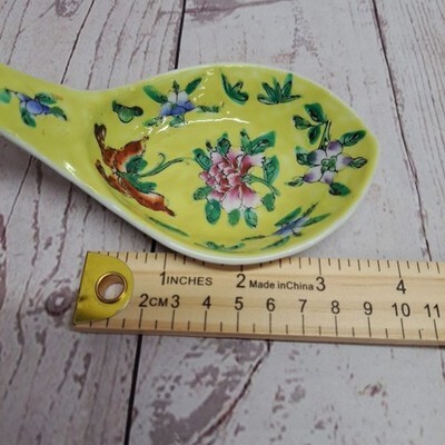 The product is a set of two large spoons or wall decor with a yellow floral design, made of porcelain and with a Chinese cultural influence. The spoons feature a blue and green color palette and are manufactured in China. These vintage ACF Hong Kong pieces are not handmade, making them a unique addition to any collection of Chinese cultural artifacts.