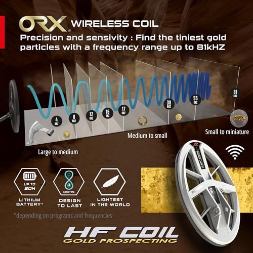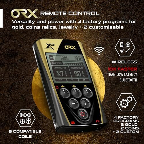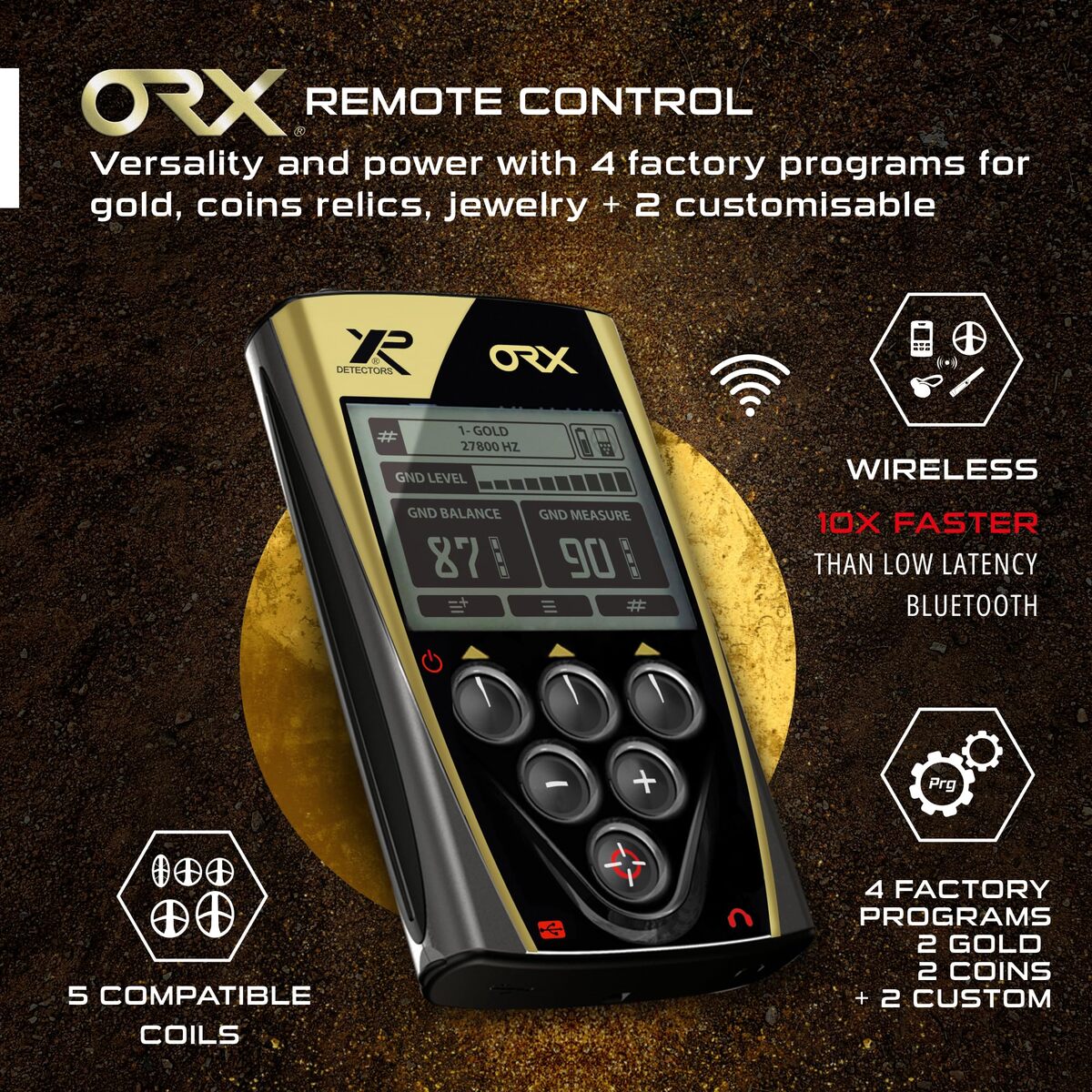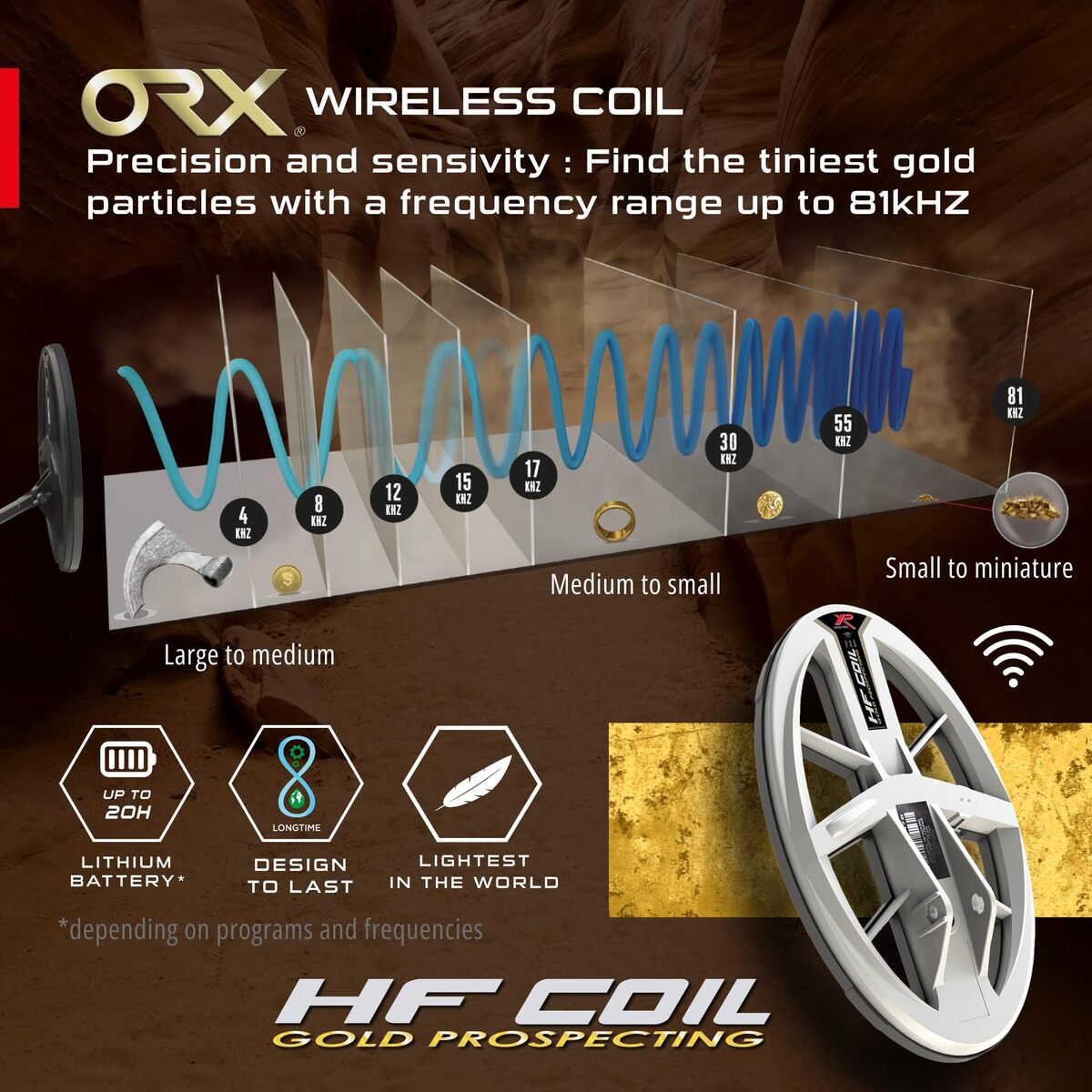 Product description: The ORX is a metal detector with extreme performance for locating natural Gold and coins, with 4 coils versions for even more possibilities, a high sensitivity, advanced features and customizable programs. It is the lightest metal detector on the market at only 1.7lbs (without remote control hip mounted) to be easy and pleasant to use. It benefits from the ultra-light S-Telescopic stem made by XP and the trusted XP fast wireless technology between the coil, the remote and the optional headset, 10 times faster compared to Bluetooth low latency technology. The ORX is easy to operate with a user-friendly interface and easy to charge with any certified USB charger or via computer (XP USB charger optional only). Whether you are an experienced user or a beginner, the ORX lets you decide whether or not to modify any of its remote control settings. Powerful pre-configured factory programs enable all users to get started immediately, while expert detectorists can choose more advanced parameters via the intuitive interface. Delivered with the WSAUDIO wireless headphones.