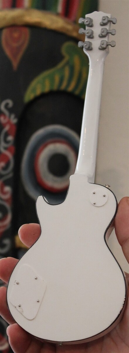 This miniature 1:4 scale replica model instrument can fit in the palm of your hand. It is approximately 10.5 inches in length and comes with a display stand. Each guitar is individually handcrafted from solid woods, plastics, resins, etc. (depending on the guitar style) with plastic tuning keys. Check out our listings for guitar hard cases and miniature amplifiers to complete your guitar set-up.