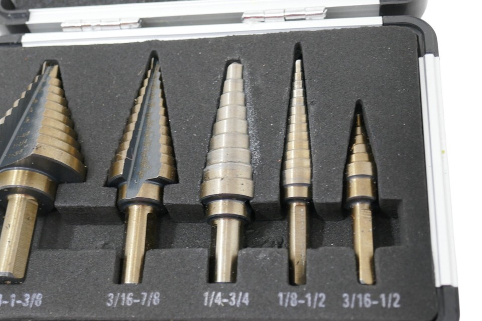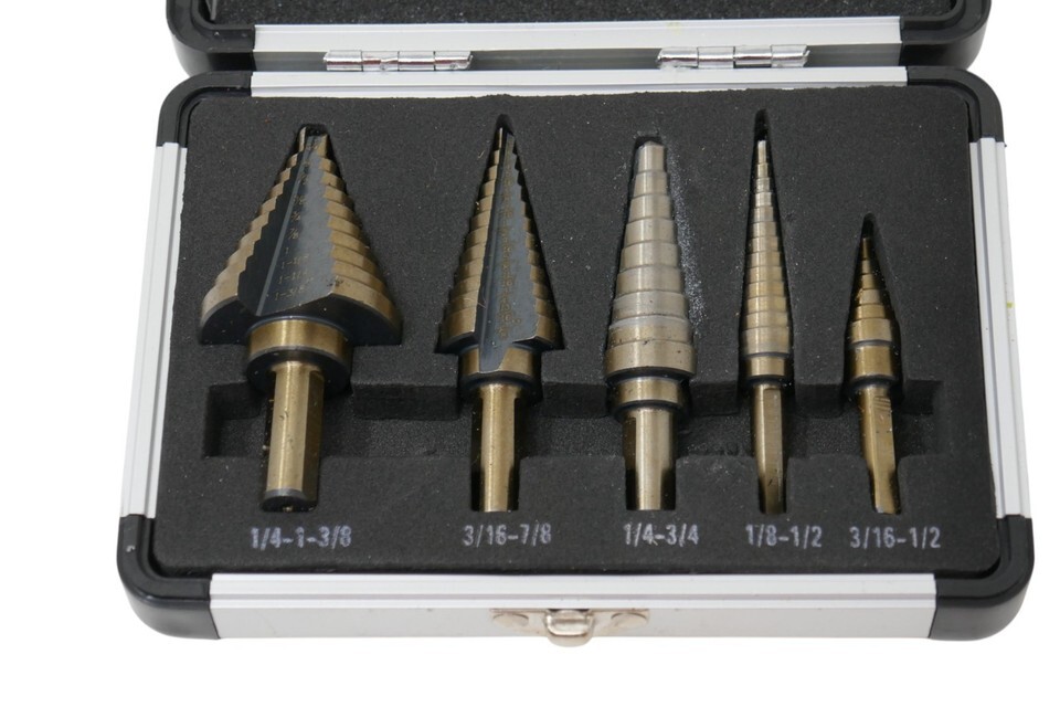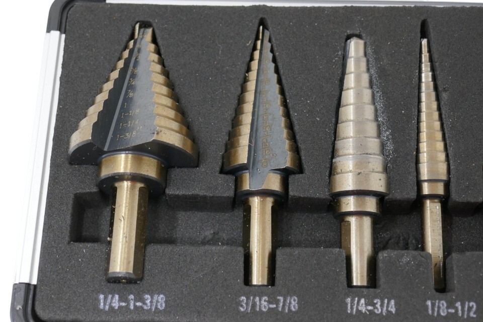 The CO-Z 5 Pieces HSS Step Drill Bit Set with Case is a versatile and high-quality tool set designed for drilling and cutting tasks. The compact case packaging makes it easy to store and transport, but does have wear. Perfect for professionals or DIY enthusiasts, this set is a valuable addition to any workshop or tool collection.