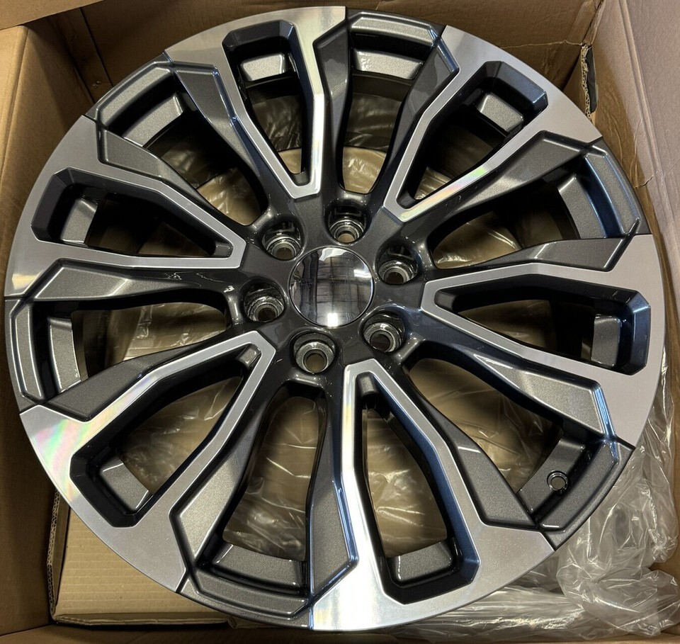 New Set Of Four GM Style Replica 22" Gunmetal And Machine 12 Spoke Denali Style Wheels With New Blackhawk Ridgecrawler R/T 285/45R22 Tires.