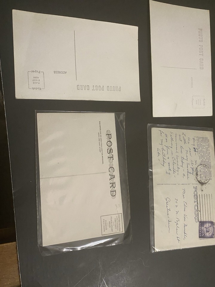 4 post cards all are Denver related. The post card of elitch gardens theatre is stamped with the Statue of Liberty purple 3 cent postage stamp. The other 3 are blank all in excellent condition.