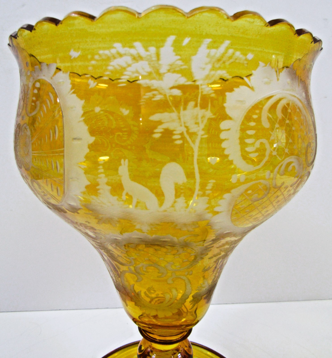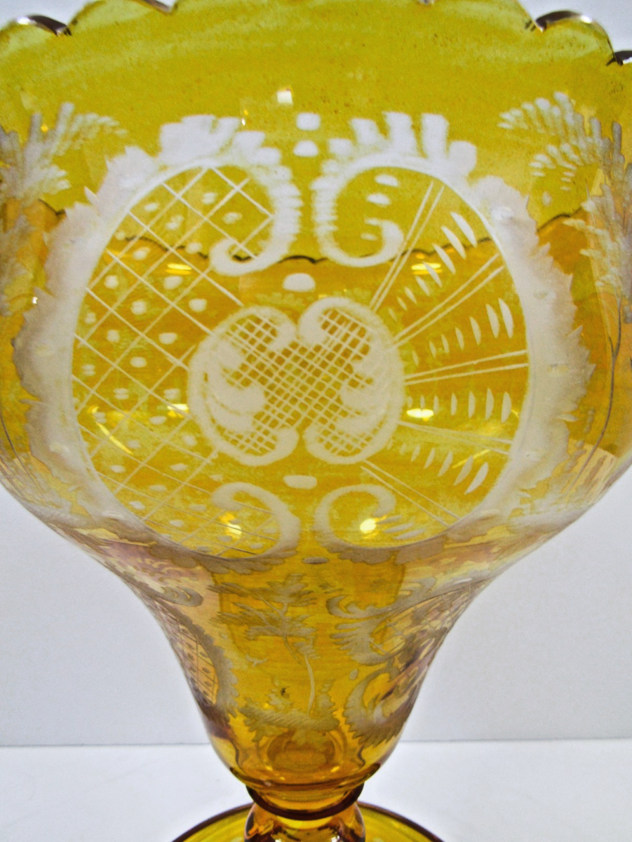 This Bohemian Amber and White Glass Ruffle Rim 9" Vase is a beautifully crafted piece with a vintage design from the Mid 20th Century. Hand-blown glass with an all-over pattern, this vase is perfect for all occasions and adds a touch of elegance to any space. The pattern is not repetitive, there are different designs and scenes. The medium-sized piece features a unique ruffle rim and a rich amber color, making it a standout decorative collectible for adults who appreciate bohemian style. This original piece is handmade and embodies the artistic craftsmanship of the era.