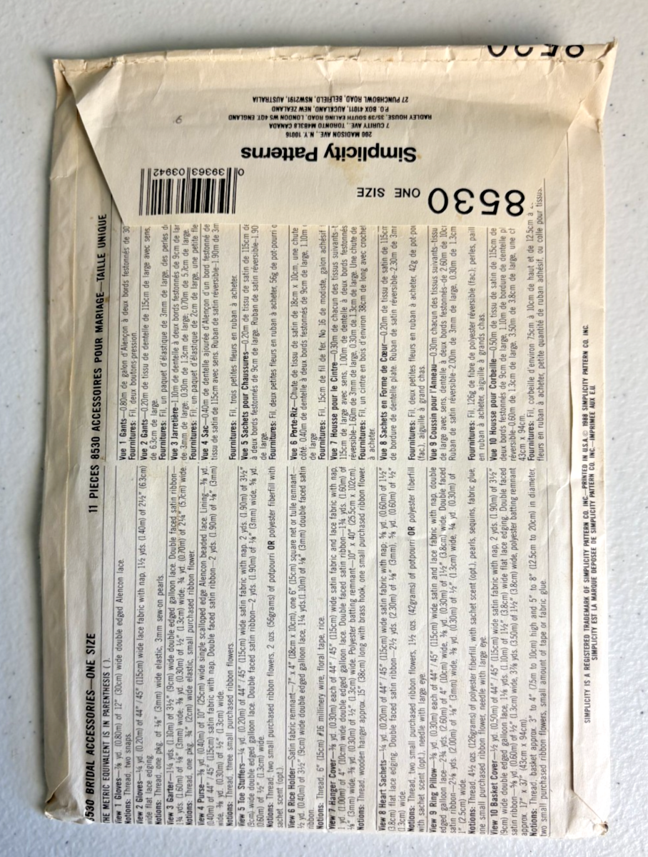 Simplicity 8530 Pattern One Size Uncut Wedding Accessories Vintage 1988 - This is a new, uncut pattern - UPC #03936303942 - See Photos for further description.