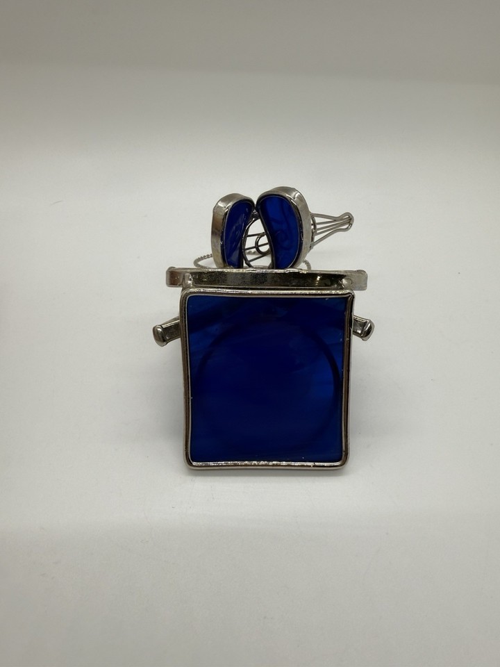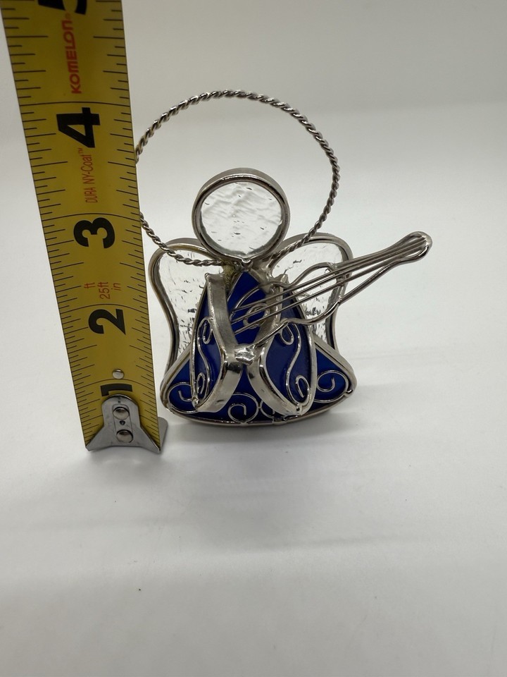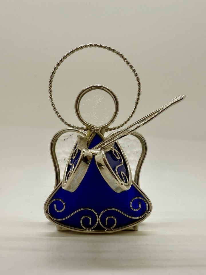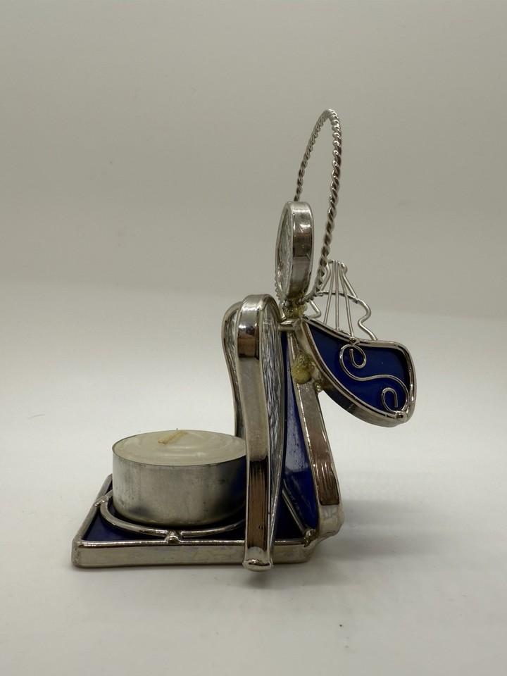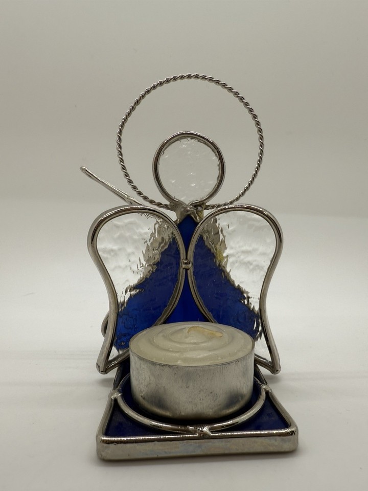 Bring a warm, spiritual glow into your home with this beautiful stained glass angel tea light holder. Crafted with cobalt blue stained glass, clear textured wings, and silver-tone solder trim, the angel features a twisted wire halo and delicate scrollwork accents.