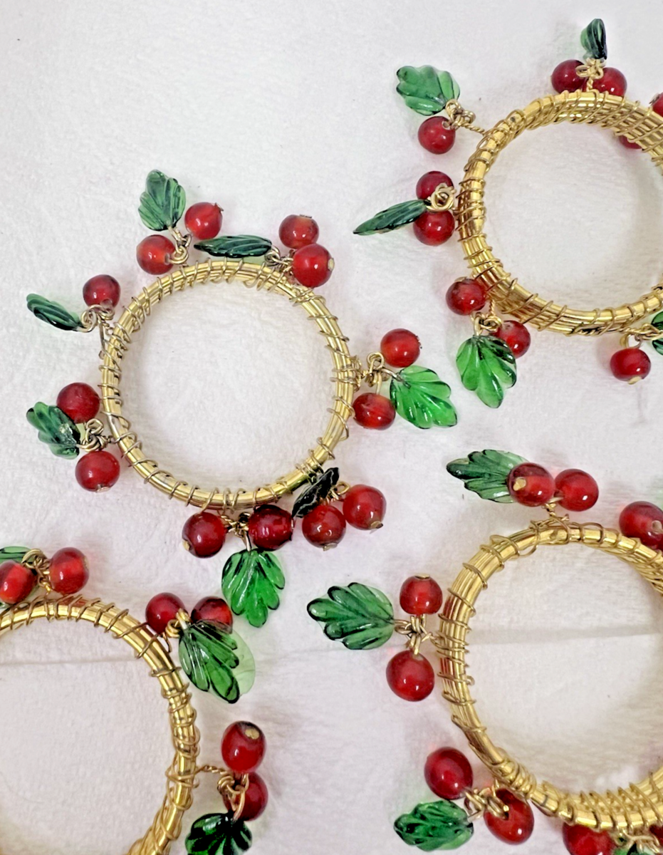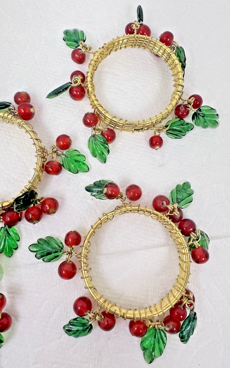 Set of 4 Fun RED Cherry Green Leaf Beady Napkin Rings Gold Tone Metal Rings