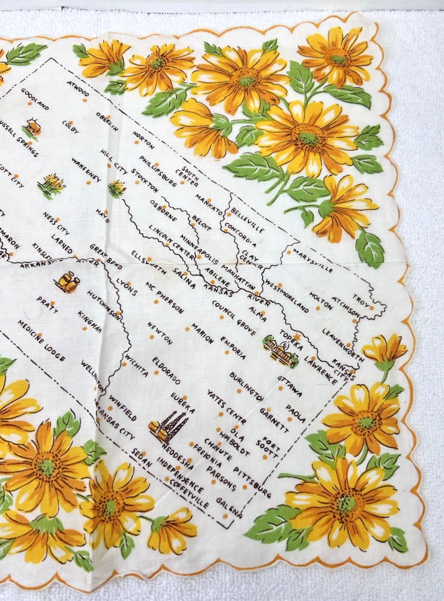 Vintage Hankies Kansas State Map w Yellow Flowers 12.5 Inch Scalloped In nice shape