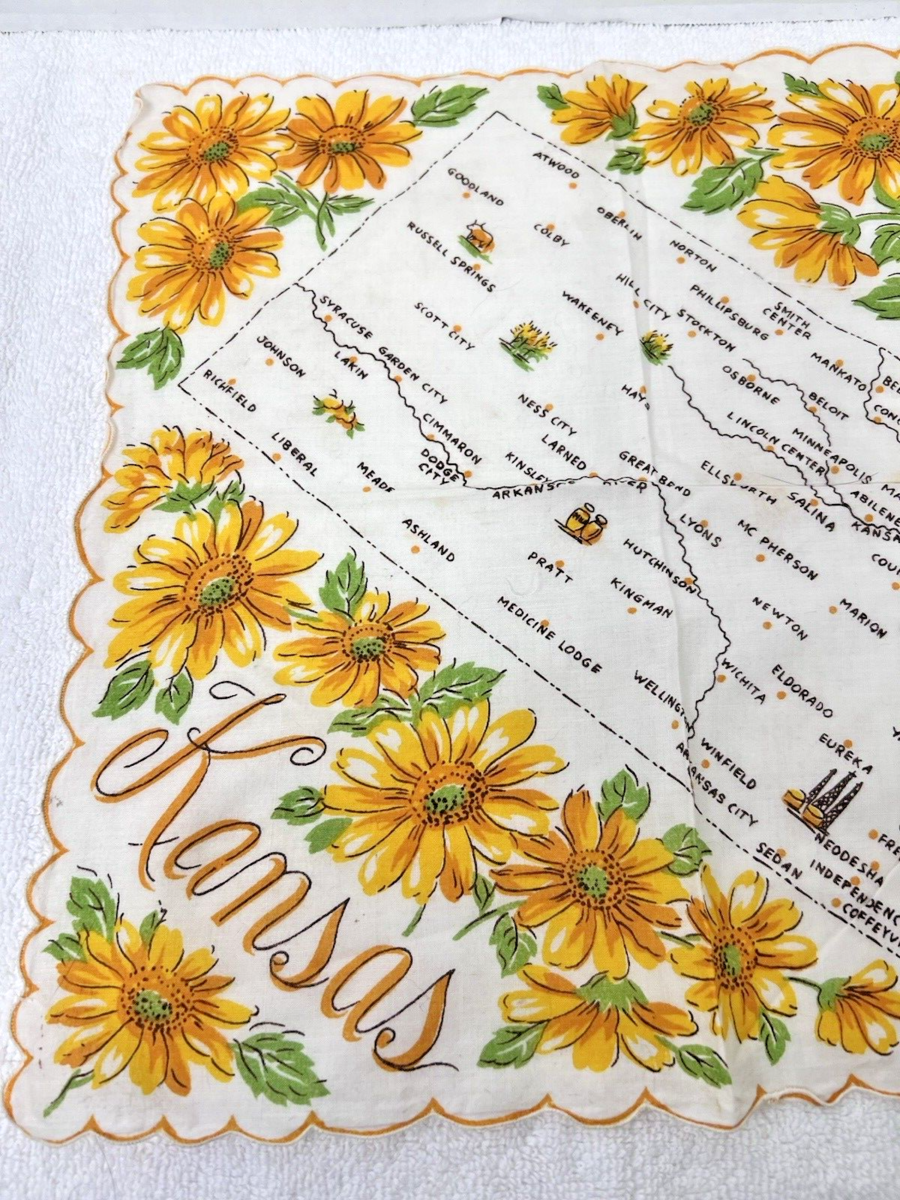 Vintage Hankies Kansas State Map w Yellow Flowers 12.5 Inch Scalloped