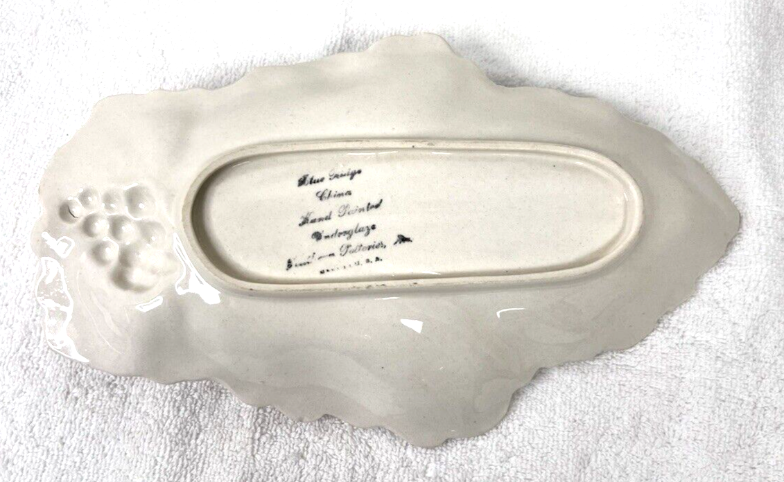 Blue Ridge Pottery Hand Painted Floral Leaf Tray 11? w Grape Cluster Handle Flake please note the tiny fleabite under the petal we have shown it from the top. 11 inches long x 6 5/8 wide