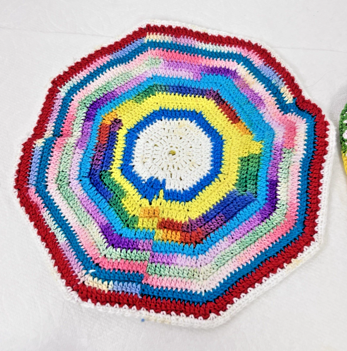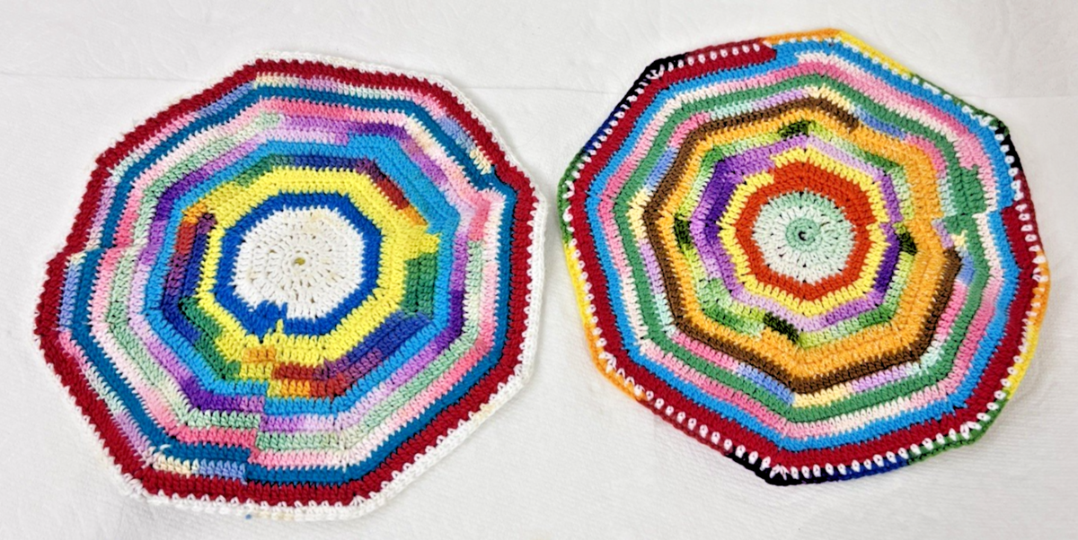 Two Hand Crocheted Rainbow Potholders Round 7 1/2" Grandma Core Lot C