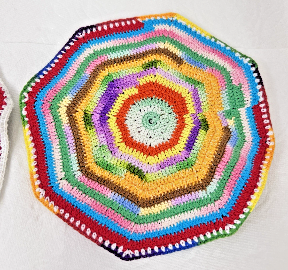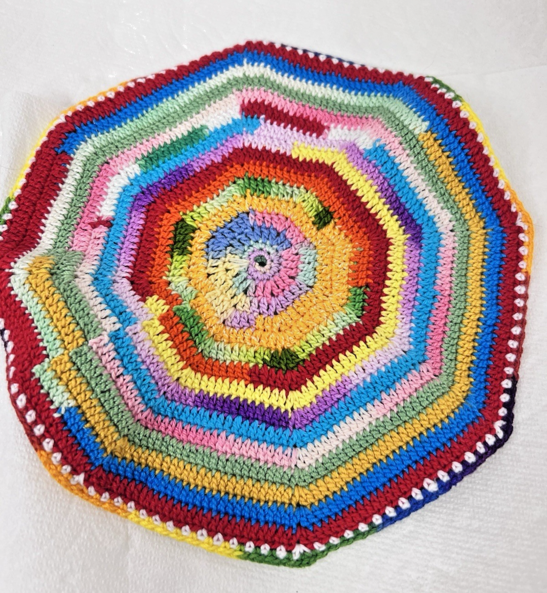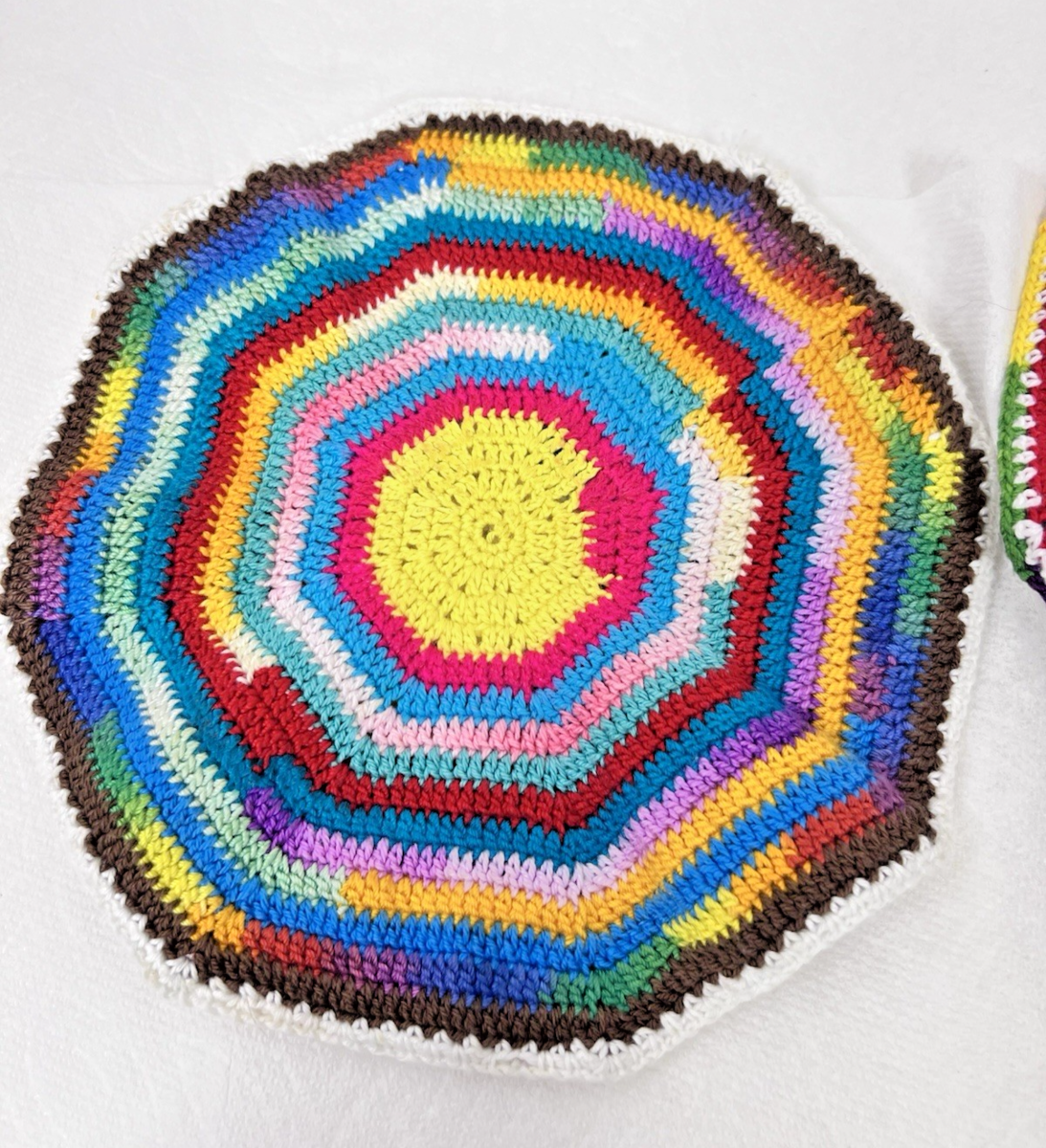 Two Hand Crocheted Rainbow Potholders Round 7 1/2" Grandma Core Lot C we have 2 other sets for sale we can combined shipping