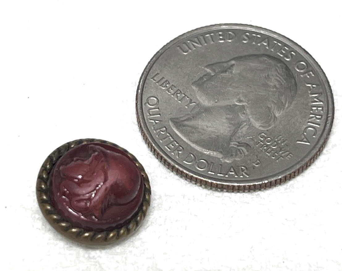 Vintage Round Metal Button Carved Pink Glass Man Hat Gold Metal Frame w Rope