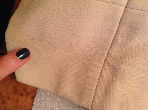 The signs of wear on this jacket are tiny discoloration marks (as seen in the photos) seen throughout the front of the jacket (particularly in the lower left corner) and a discoloration mark on the top of the left shoulder (in the back), as well as along the left sleeve. There is also one small imperceptible snag. Otherwise the jacket is in pristine condition!