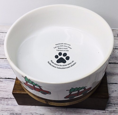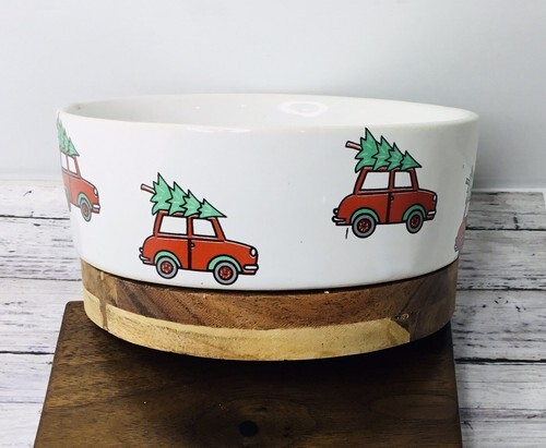 Feed Bowl Ceramic on Wood Base 3.5"x6" Red Truck Christmas Tree Dog Water