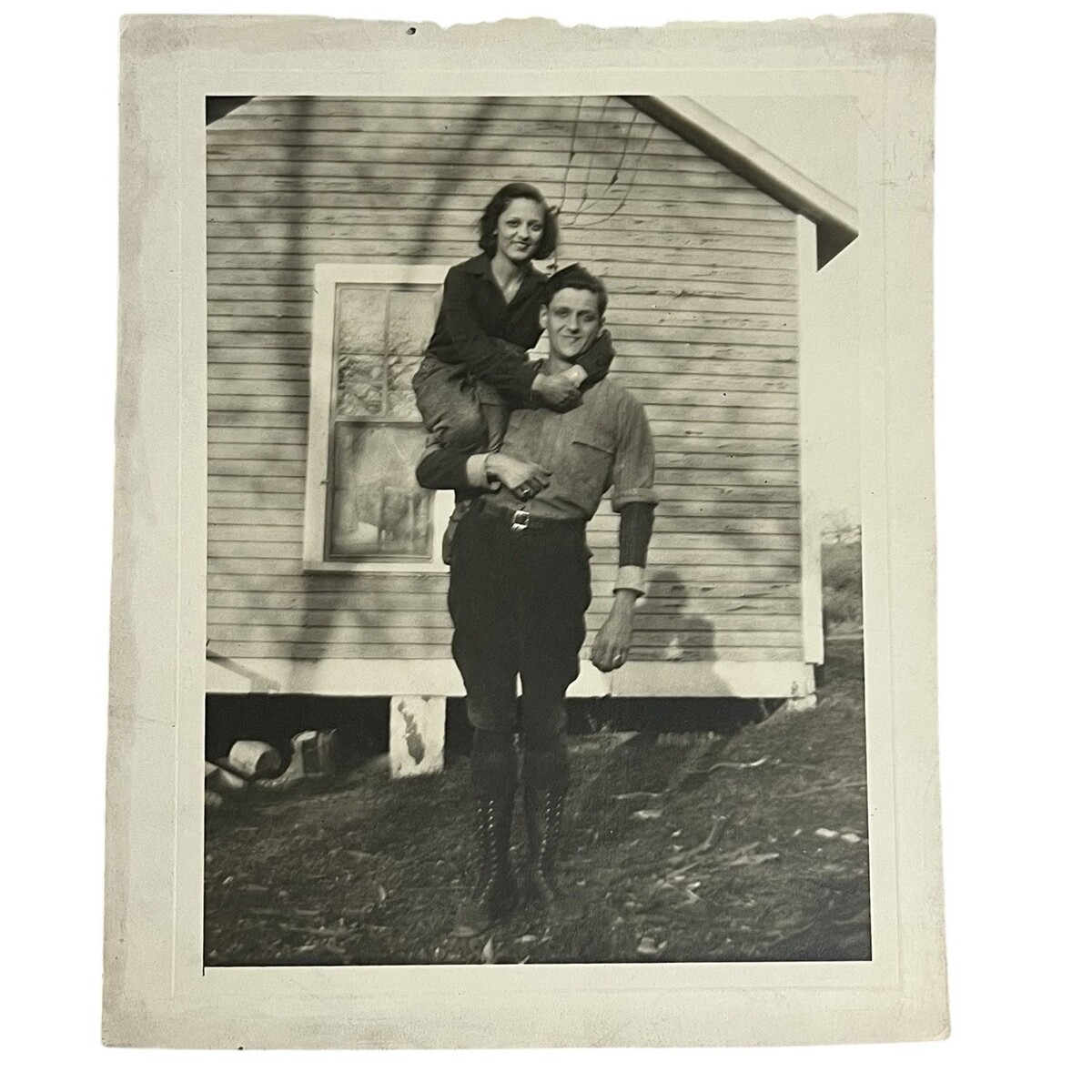 Vtg 1930s Photo Strongman Holding Woman Couple Snapshot B&W Embossed Border