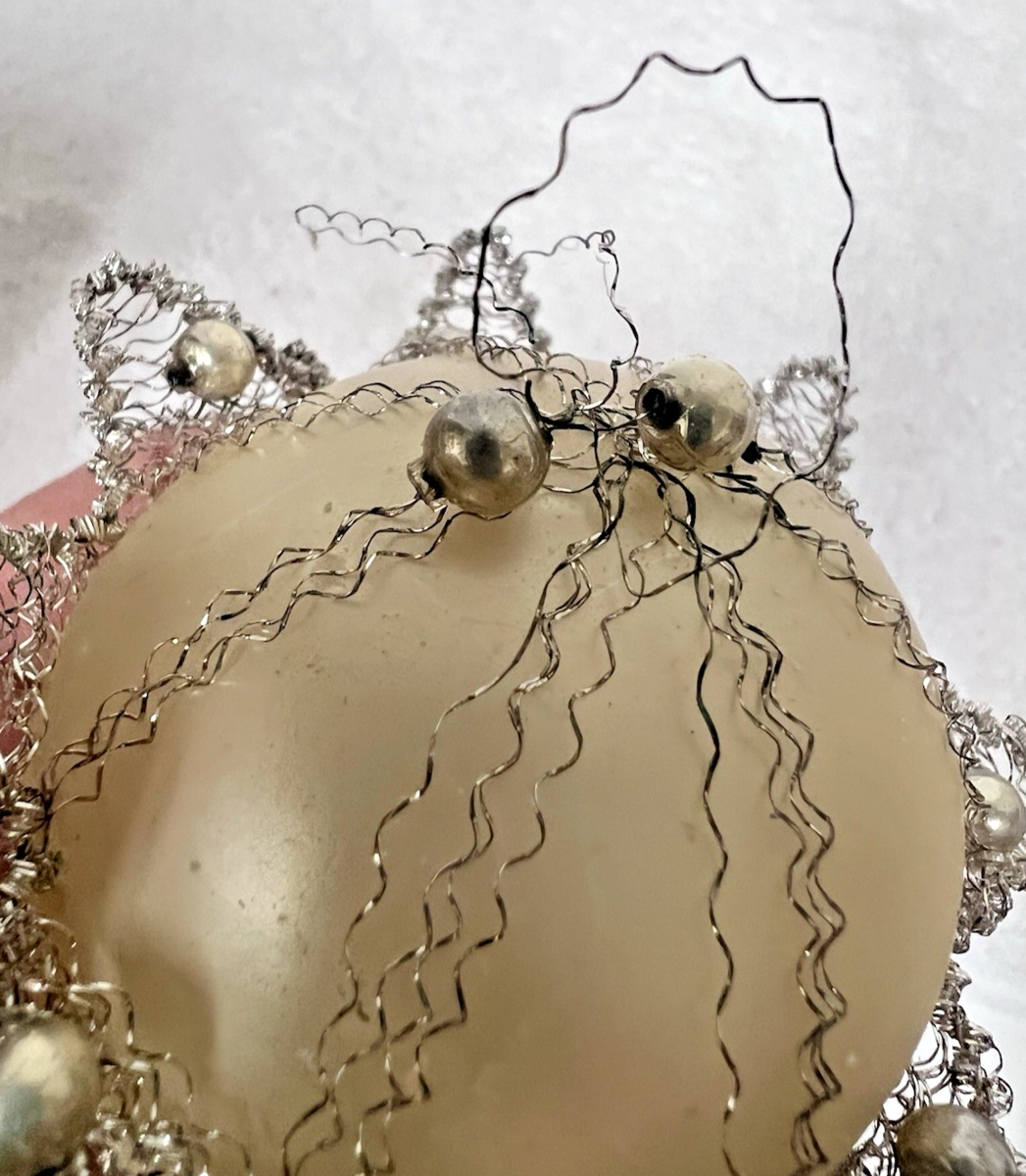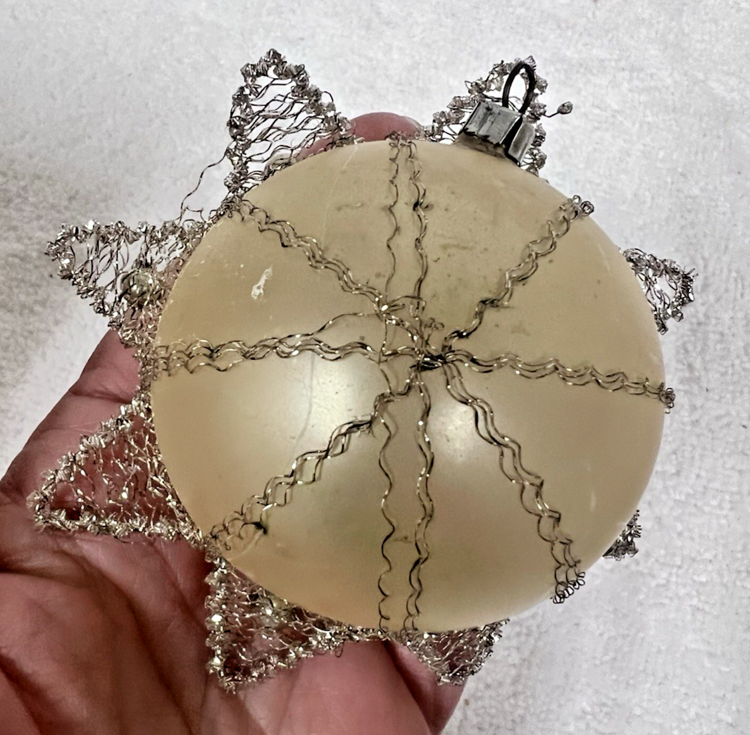 Vintage CRM Glass w Crinkle Wire Star Beads Ball Christmas Ornament W Germany In good shape the cream has speckles and spots from years of use it is missing 1 bead and a couple wires have gone wild