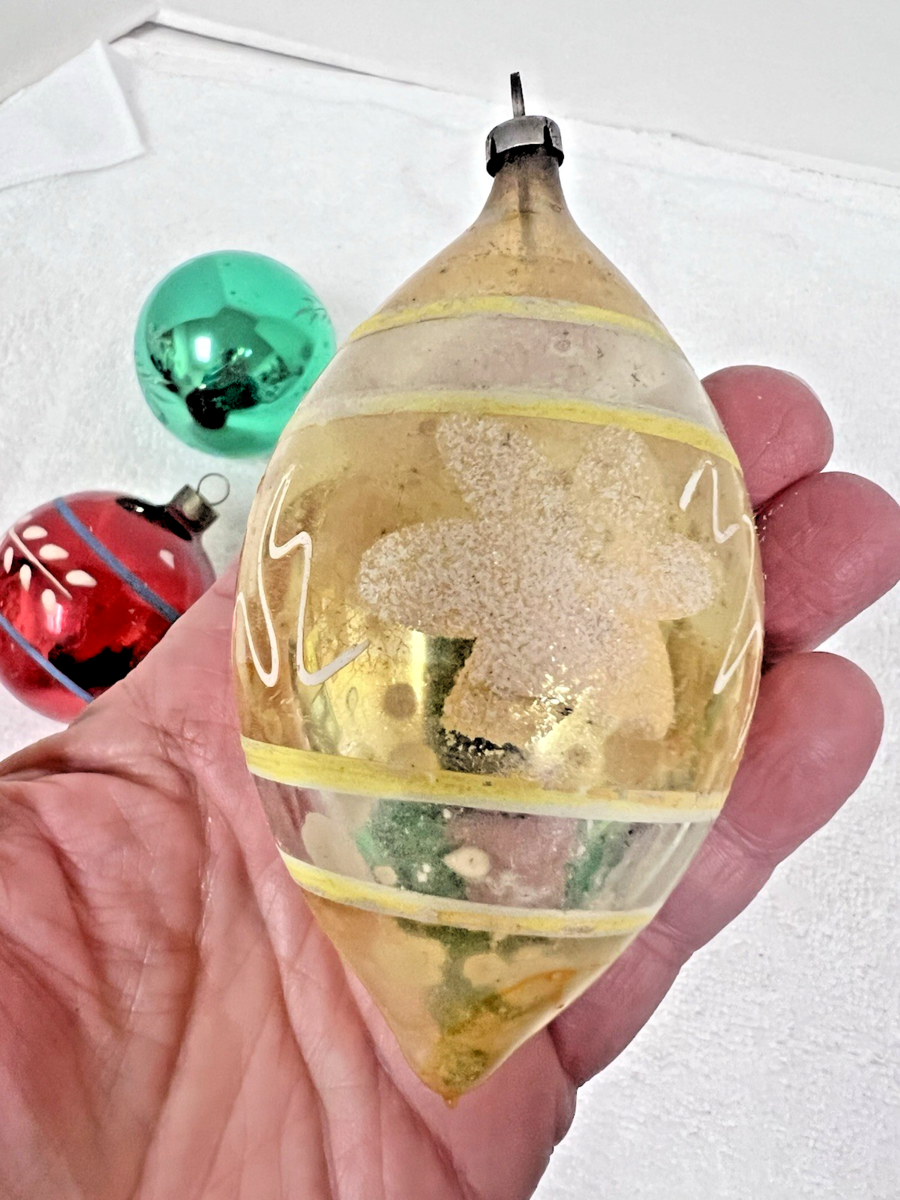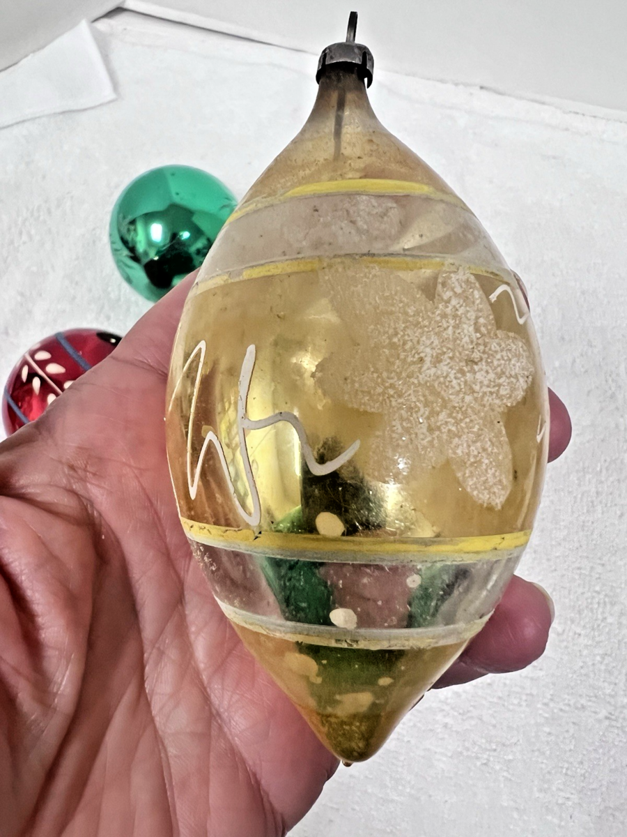 3 Vintage Glass Hand Painted Red Green Yellow Ball Christmas Ornament The green has bells the red leaves and the yellow a sugar mica flower rounds are about 3 inches the yellow about 4 they all have speckling and spots form years of use