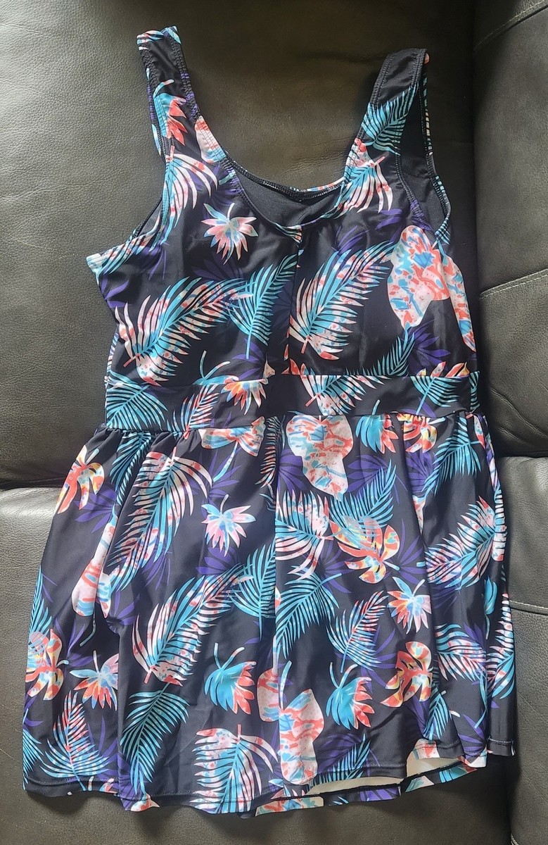The product is a women's XL swim dress in a multicolor floral pattern, perfect for beach-themed occasions. It is a regular size fit. This swim dress combines style and comfort for a flattering and stylish look while at the beach or pool.