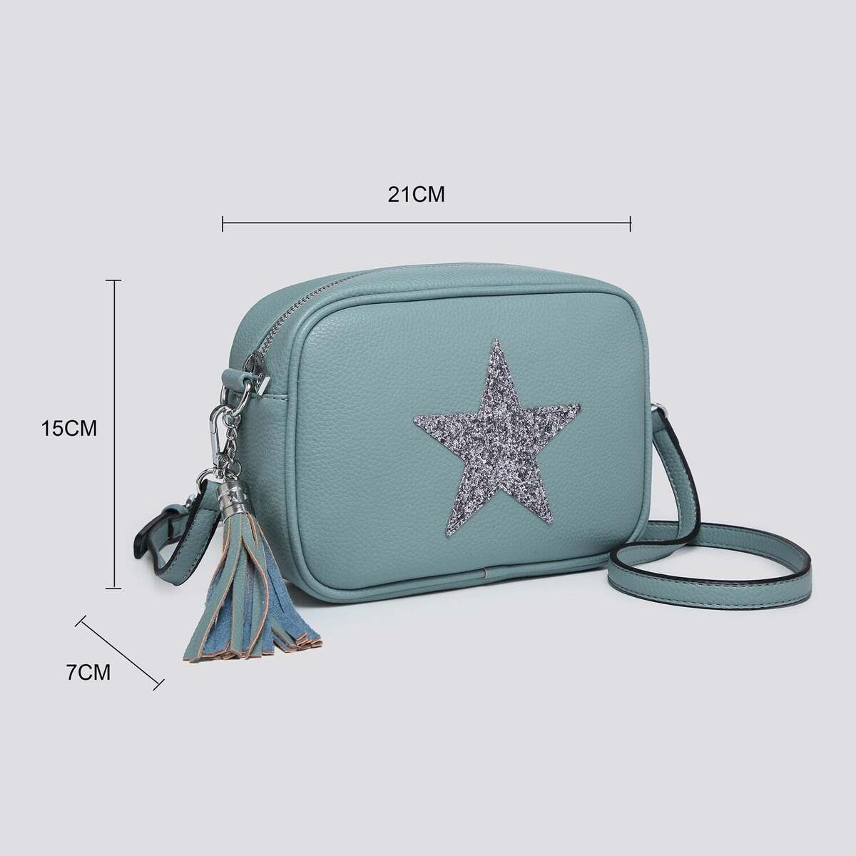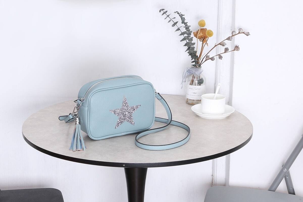 Lady faux leather handbag with a glitter star with a detachable shoulder strap.