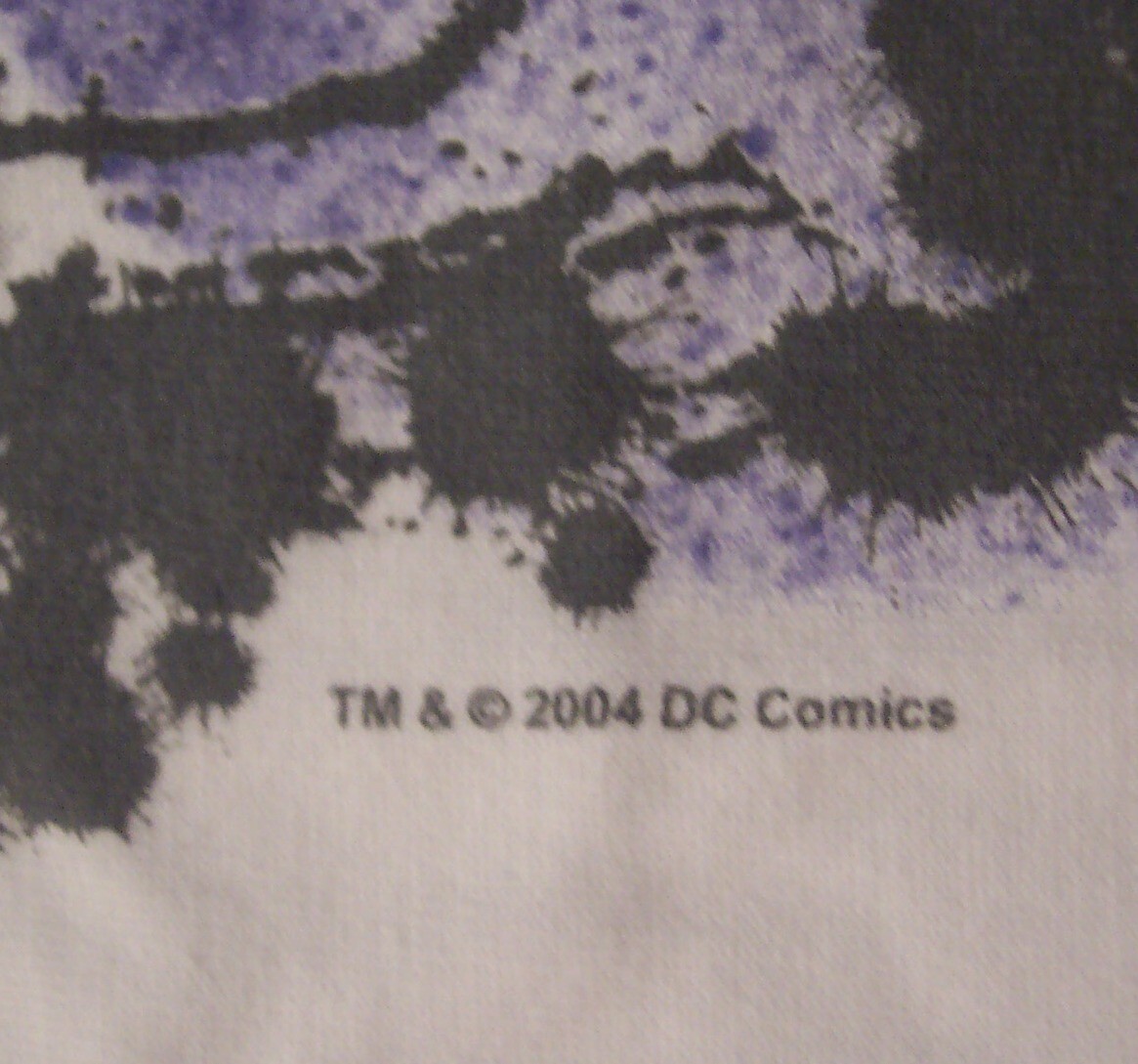 This is a Vintage BATMAN Dc Comics T-shirt from 2002. It is a Size LARGE. It is 21 1/2 inches from armpit to armpit and 30 inches in length. It is in Good Condition. No Stains or Tears. It does have one pinsize little brown mark on the lower back trim of the shirt. Very small. See 6th picture for details. It may come out in the wash with the right cleaning product. I have not tried. Either way not going to be very noticeable when worn. 100% Cotton. Combine auctions to save on shipping. EAG