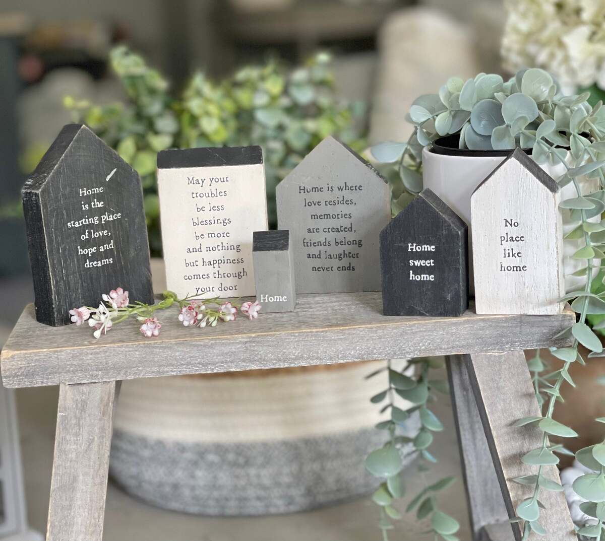 Wooden House which reads: Home Is where love resides, memories are created, friends belong and laughter never ends.